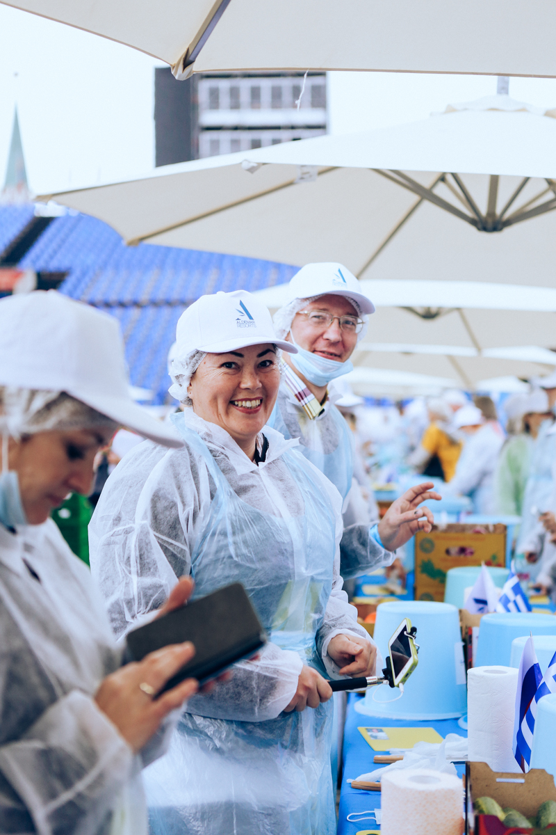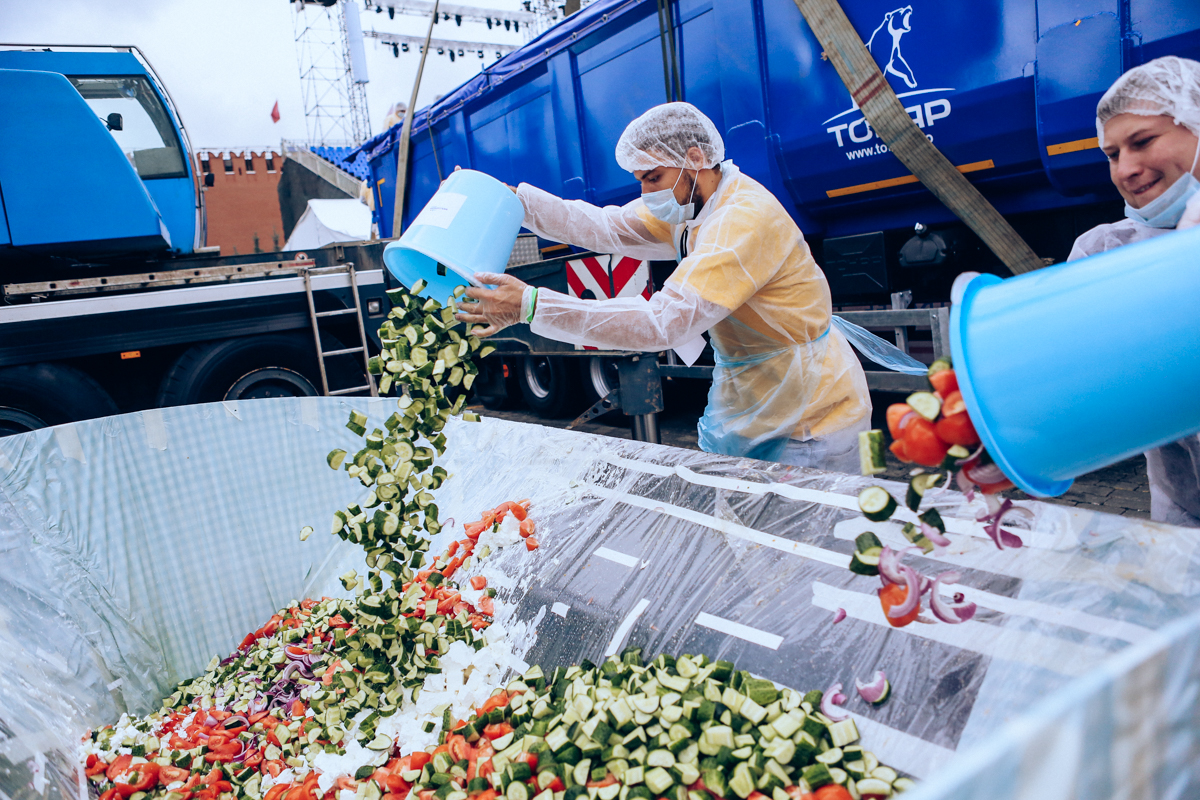 Τα βραβεία Guinness είχαν μέχρι στιγμής καταγράψει μεγαλύτερη σαλάτα εκείνη ενός Αυστριακού, με βάρος μόλις 8,6 τόνους. Τα υλικά της χωριάτικης έπεφταν σε ένα τεράστιο container με τη βοήθεια φορτωτικών μηχανών.