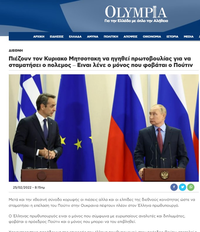 «Μετά και την χθεσινή σύνοδο κορυφής οι πιέσεις αλλά και οι ελπίδες της διεθνούς κοινότητας ώστε να σταματήσει η επέλαση του Πούτιν στην Ουκρανια πέφτουν πλέον στον Έλληνα πρωθυπουργό. Ο Έλληνας πρωθυπουργός είναι ο μόνος που σύμφωνα με ευρωπαίους αναλυτές και διπλωμάτες, φοβάται ο πρόεδρος Πούτιν και ο μόνος που μπορεί να του επιβληθεί».