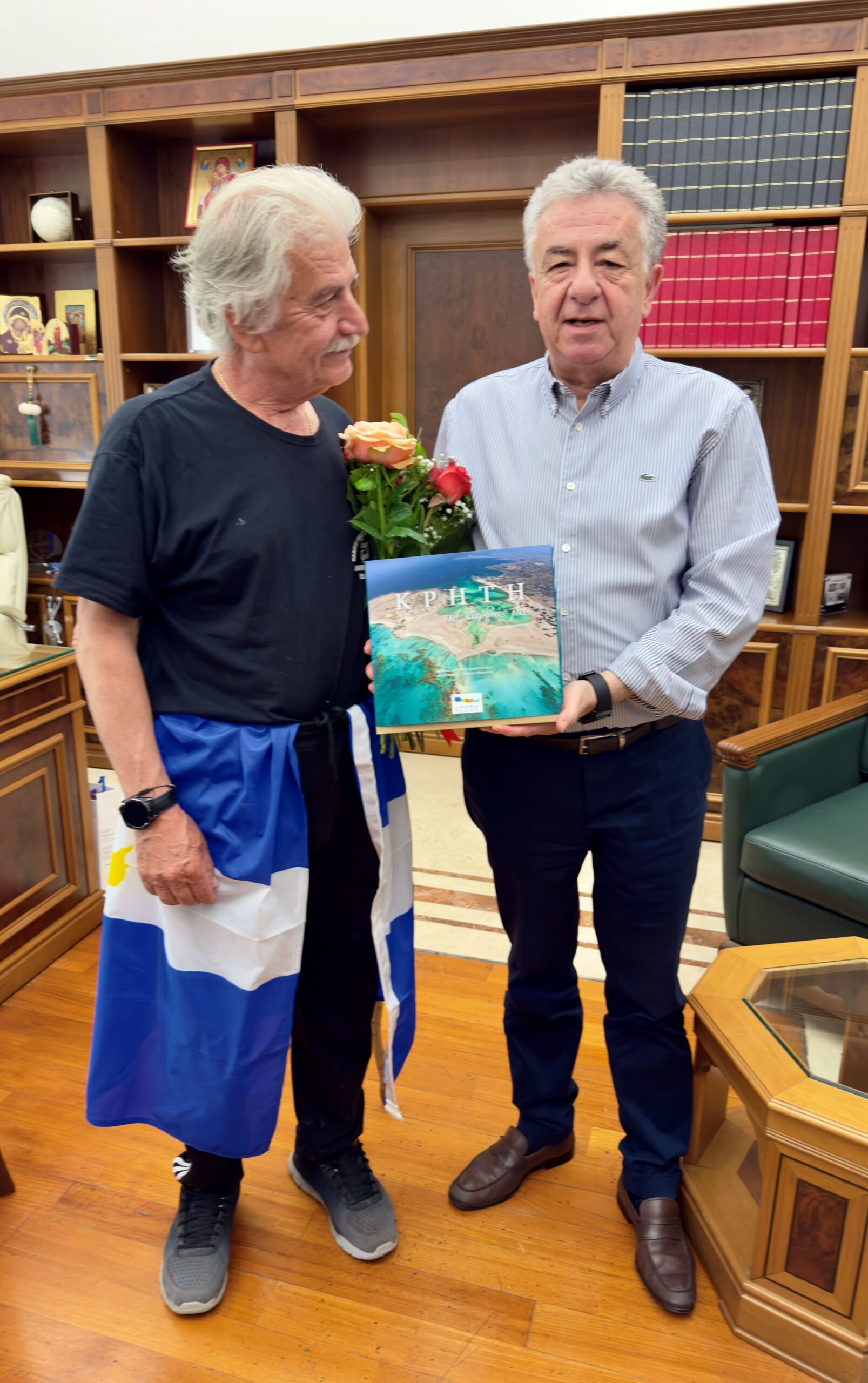 Τον αθλητή υπεραποστάσεων Θεοχάρη Αθητάκη υποδέχθηκε σήμερα στο κτίριο της Περιφέρειας ο Περιφερειάρχης Κρήτης Σταύρος Αρναουτάκης, με αφορμή την ολοκλήρωση της ιστορικής διαδρομής 153 χιλιομέτρων που πραγματοποίησε ο αθλητής από την Ανώπολη Σφακίων προς το Ηράκλειο.