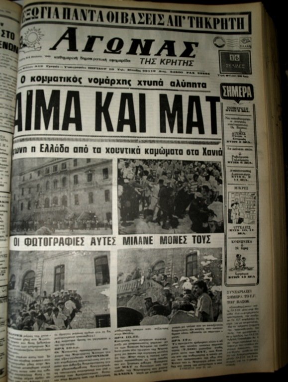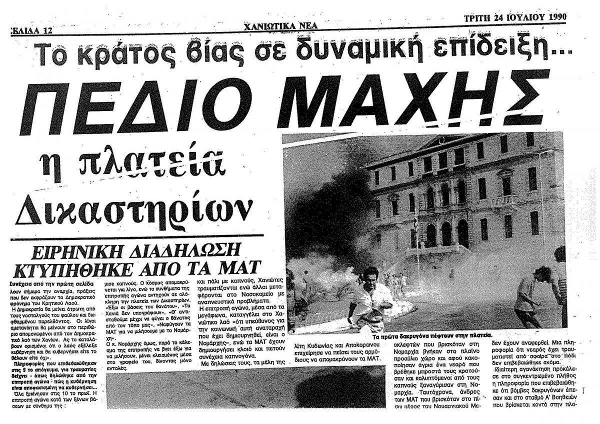 Τα ΜΑΤ ήταν αμπαρωμένα μέσα στη νομαρχία, και τη νύχτα οι διαδηλωτές ήταν αδιαμφισβήτητα οι κυρίαρχοι στα Χανιά. Εμείς συνεδριάσαμε αργά το απόγευμα σε μία θυελλώδη αλλά συνάμα και μεγαλειώδη συνεδρίαση της Επιτροπής. Συμμετείχαν εκατοντάδες, θυμάμαι. Κάποιοι φοβήθηκαν ότι αν γίνει διαδήλωση θα χυθεί αίμα κι αν κτυπήσουν τα ΜΑΤ, θα υπάρξουν ένοπλα αντίποινα.