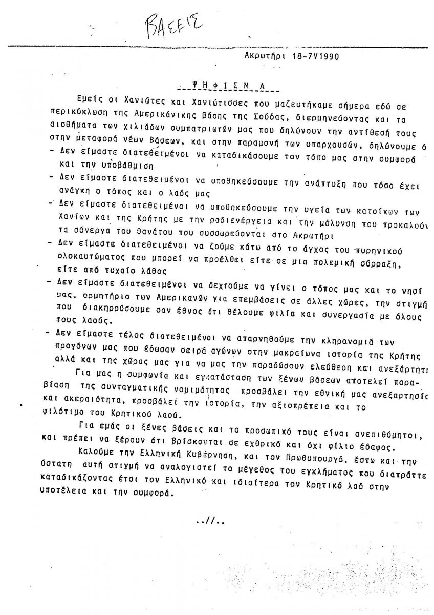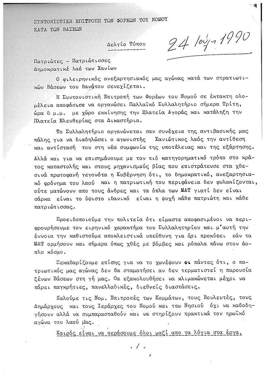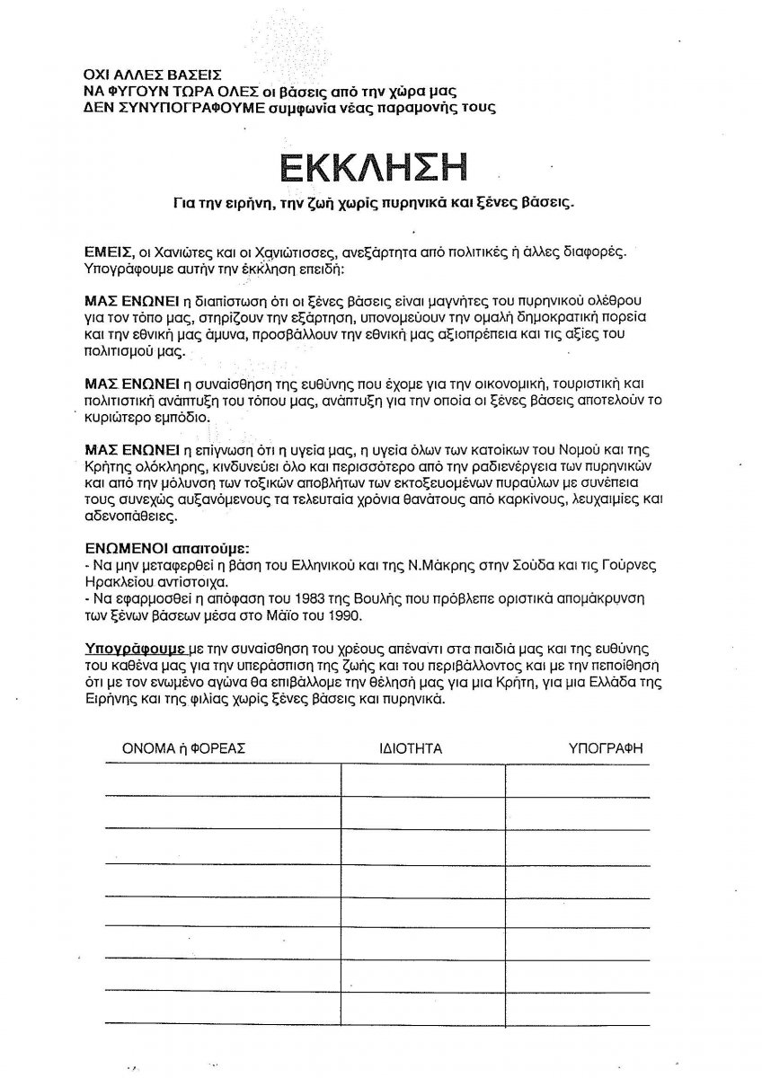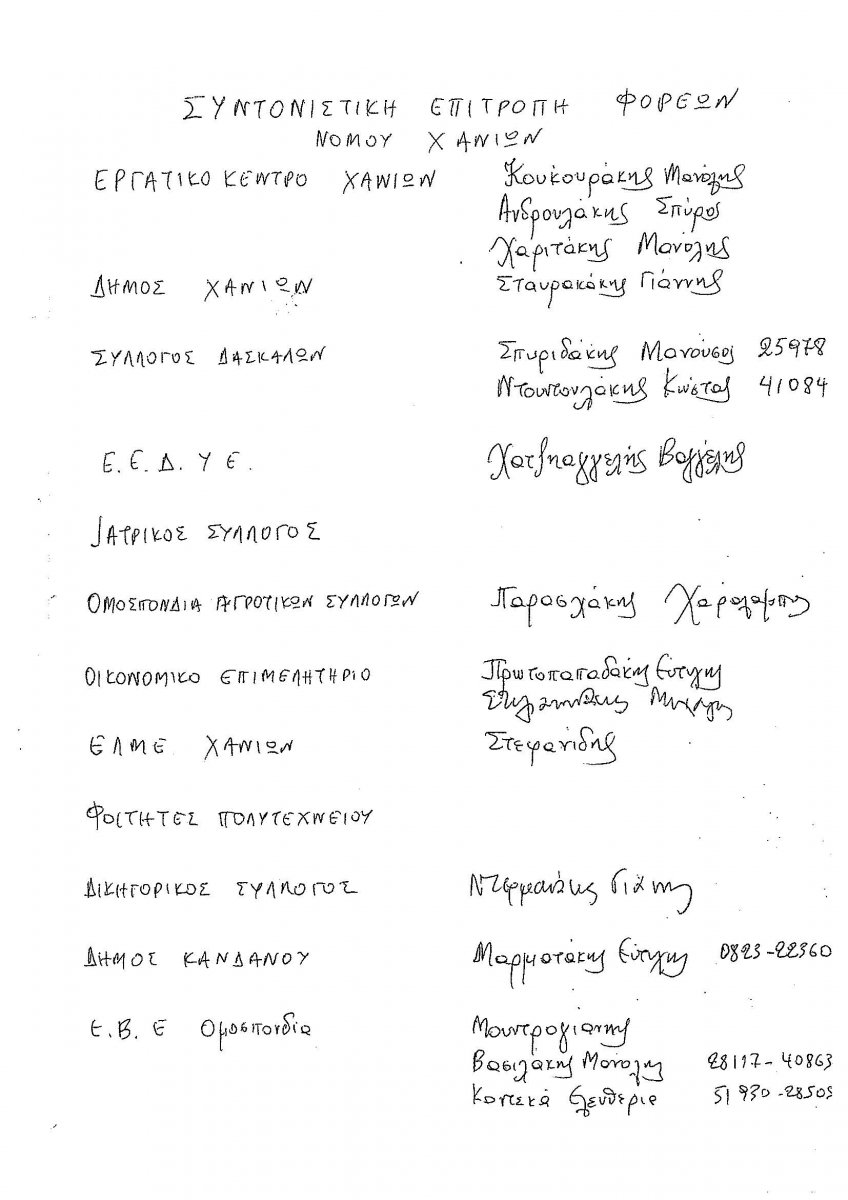 Οι πρώτες υπογραφές που αποτέλεσαν και την αρχική Συντονιστική Επιτροπή Φορέων ν. Χανίων Κατά των Βάσεων