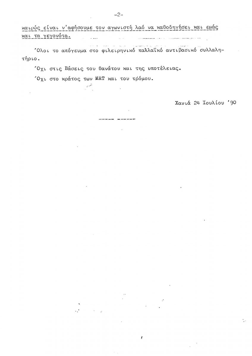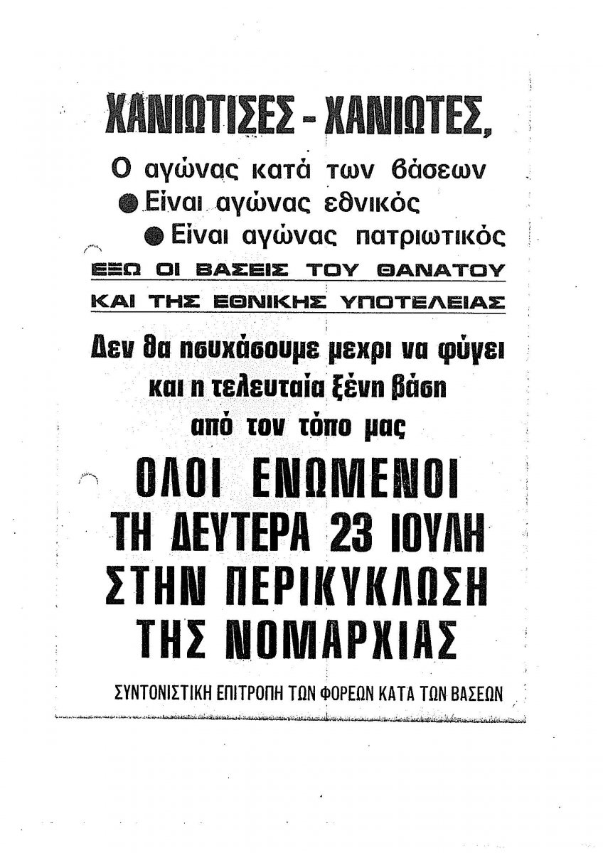 Λοιπόν, 23 Ιουλίου ψηφιζόταν η Συμφωνία. Βέβαια ήταν μια μέρα που για κάθε λογικό άνθρωπο – και για εμάς – δεν πετούσαμε στα σύννεφα, δεν ζούσαμε σε άλλο πλανήτη – φαινόταν τετελεσμένο γεγονός: θα ψηφιζόταν η Συμφωνία. Όμως είπαμε, να μην περάσει κι έτσι αδιαμαρτύρητα. Και ειδικά εδώ στα Χανιά, που είναι η μεγαλύτερη βάση. Κι έτσι, αποφασίζουμε να κάνουμε την γνωστή κινητοποίηση που οδήγησε στα «Γεγονότα της Νομαρχίας».