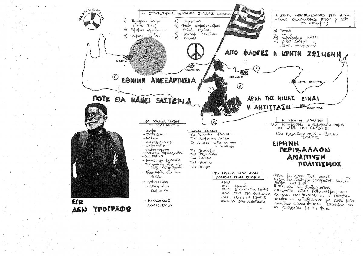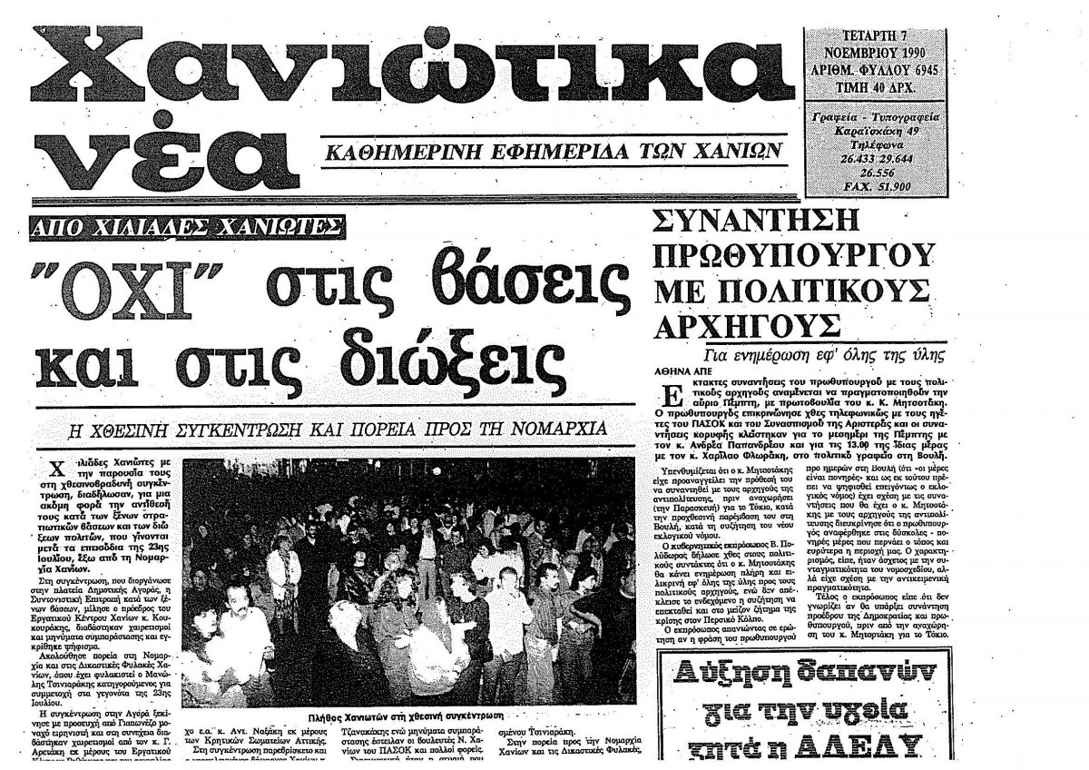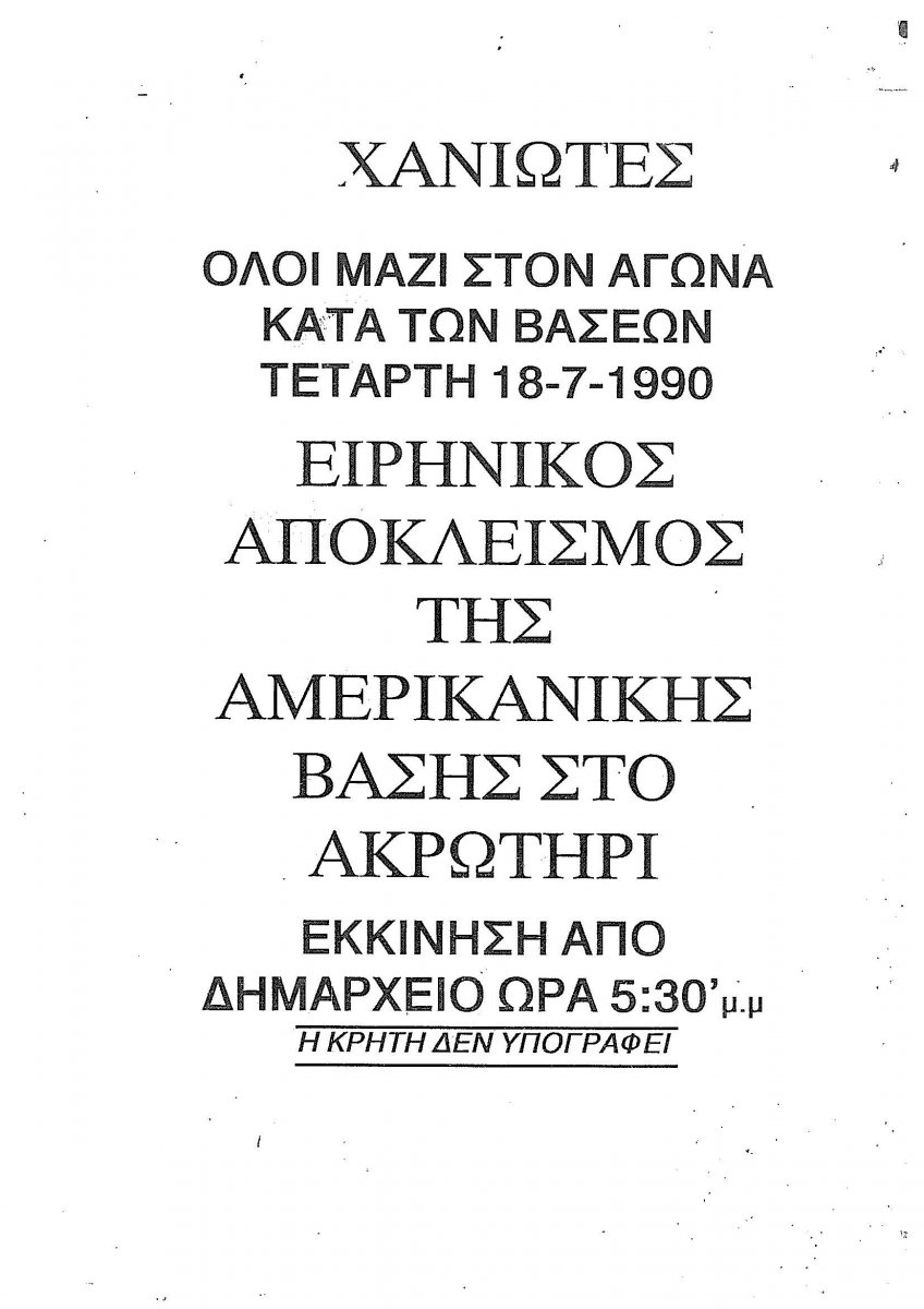 ΕΡ.: Υπό αυτές τις συνθήκες γεννήθηκε κάτι πραγματικό καινούργιο στα Χανιά, σε μία χώρα όπως η Ελλάδα που δεν είχα παράδοση σε αυτό που λέμε «κοινωνία των πολιτών», που οι κομματικοί μηχανισμοί ήταν πάρα πολύ ισχυροί, και όλα αυτά σε ένα παγκόσμιο περιβάλλον όπου η κατάρρευση της Σοβιετικής Ένωσης είχε καταστήσει οράματα – έστω και πρόσκαιρα – ανενεργά. Πραγματικά, πώς εξηγείται η δημιουργία ενός τέτοιου κινήματος υπό τέτοιες συνθήκες; Πώς εξηγείται η ίδρυση της Επιτροπής Φορέων, η διάρκεια και η ένταση των κινητοποιήσεων με αίτημα να φύγουν οι βάσεις και να τελειώσει η εξάρτηση από τον ξένο παράγοντα;