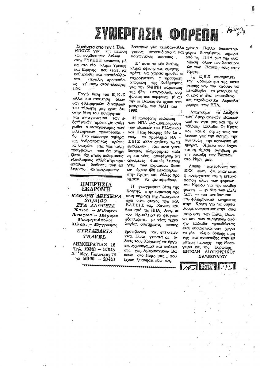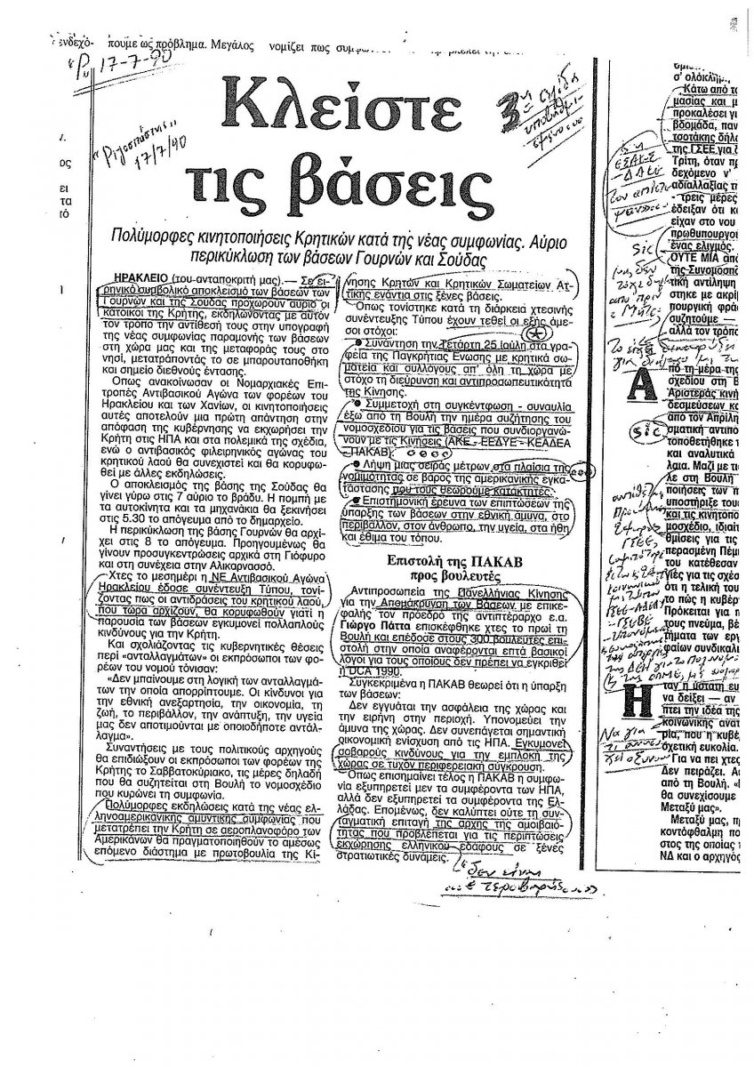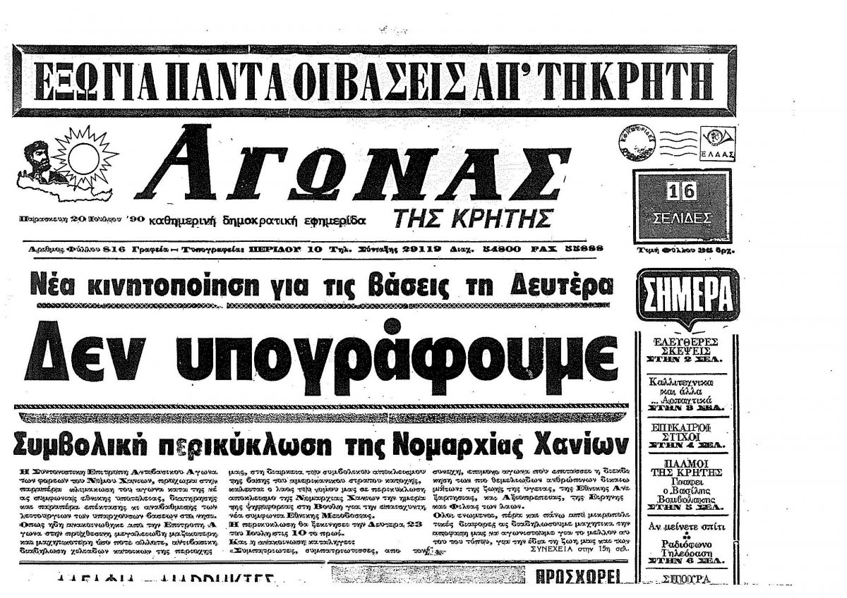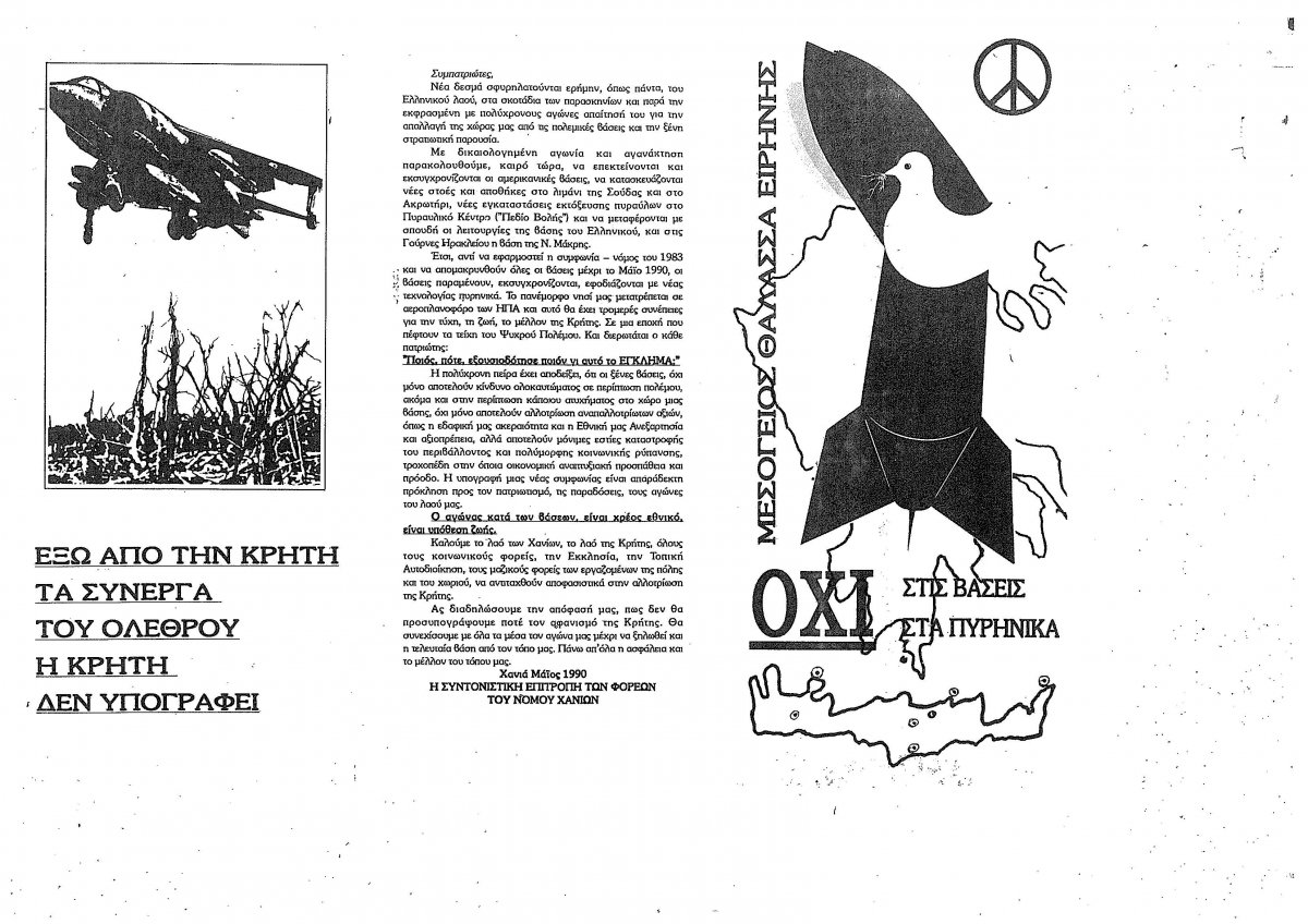 ΕΡ.: Υπό αυτές τις συνθήκες γεννήθηκε κάτι πραγματικό καινούργιο στα Χανιά, σε μία χώρα όπως η Ελλάδα που δεν είχα παράδοση σε αυτό που λέμε «κοινωνία των πολιτών», που οι κομματικοί μηχανισμοί ήταν πάρα πολύ ισχυροί, και όλα αυτά σε ένα παγκόσμιο περιβάλλον όπου η κατάρρευση της Σοβιετικής Ένωσης είχε καταστήσει οράματα – έστω και πρόσκαιρα – ανενεργά. Πραγματικά, πώς εξηγείται η δημιουργία ενός τέτοιου κινήματος υπό τέτοιες συνθήκες; Πώς εξηγείται η ίδρυση της Επιτροπής Φορέων, η διάρκεια και η ένταση των κινητοποιήσεων με αίτημα να φύγουν οι βάσεις και να τελειώσει η εξάρτηση από τον ξένο παράγοντα;