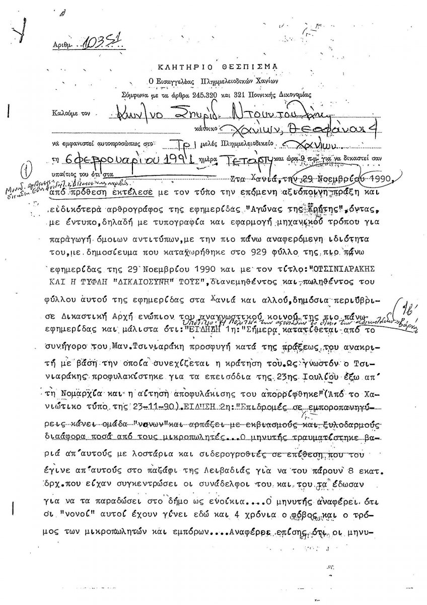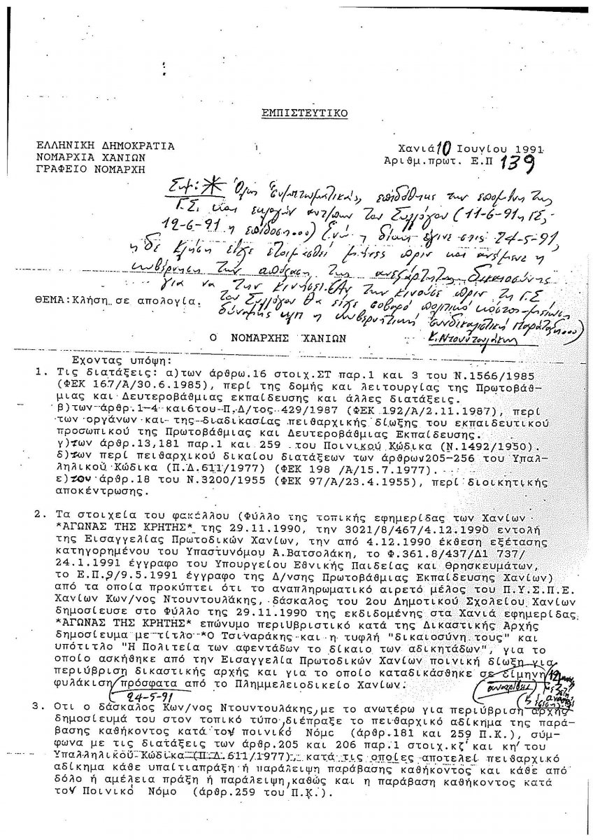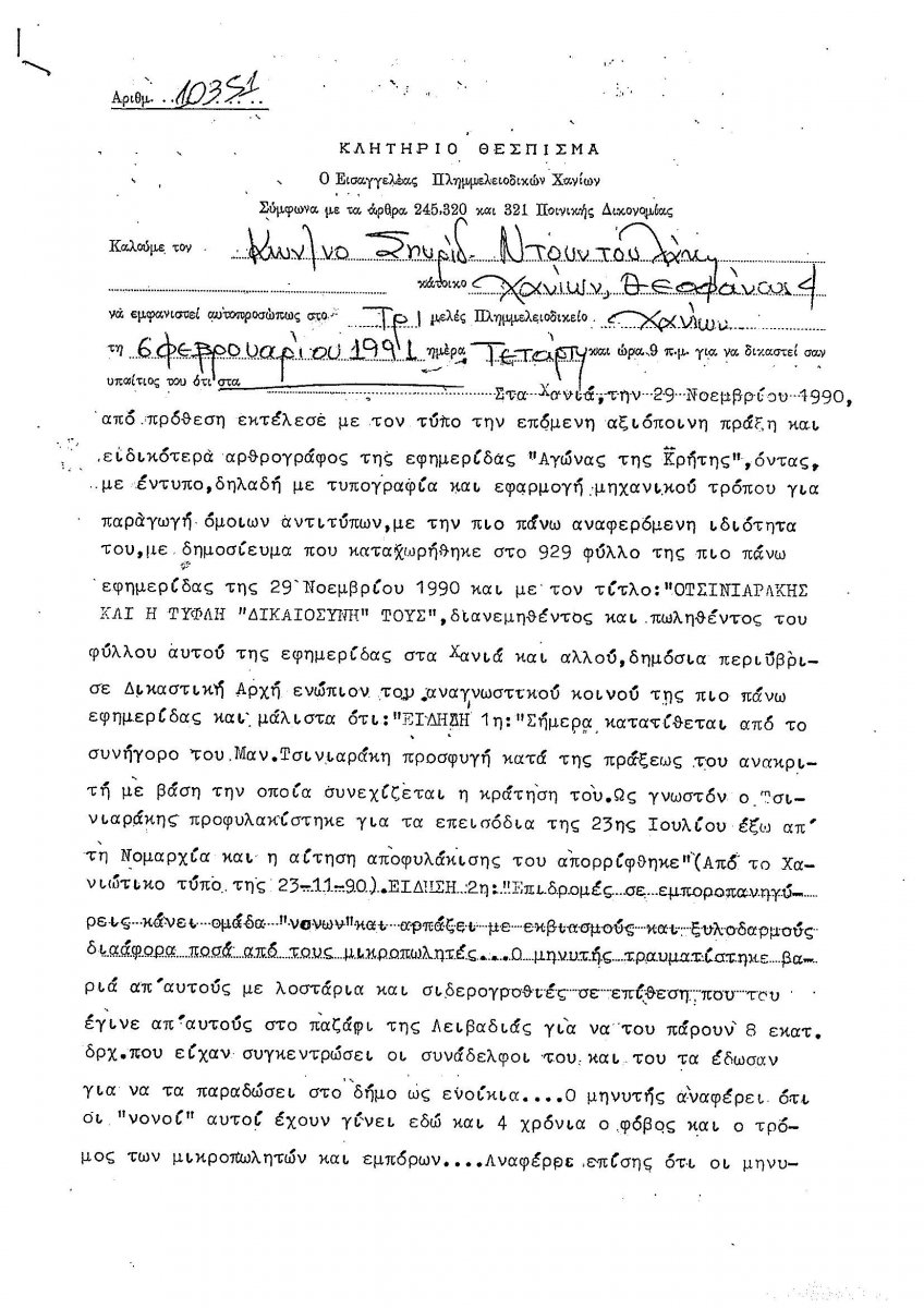 Κλητήριο θέσπισμα προς τον Κωνσταντίνο Σπυρίδωνα Ντουντουλάκη για δημοσίευμά του στον “Αγώνα της Κρήτης”