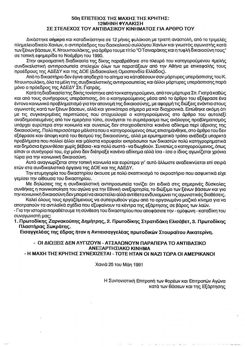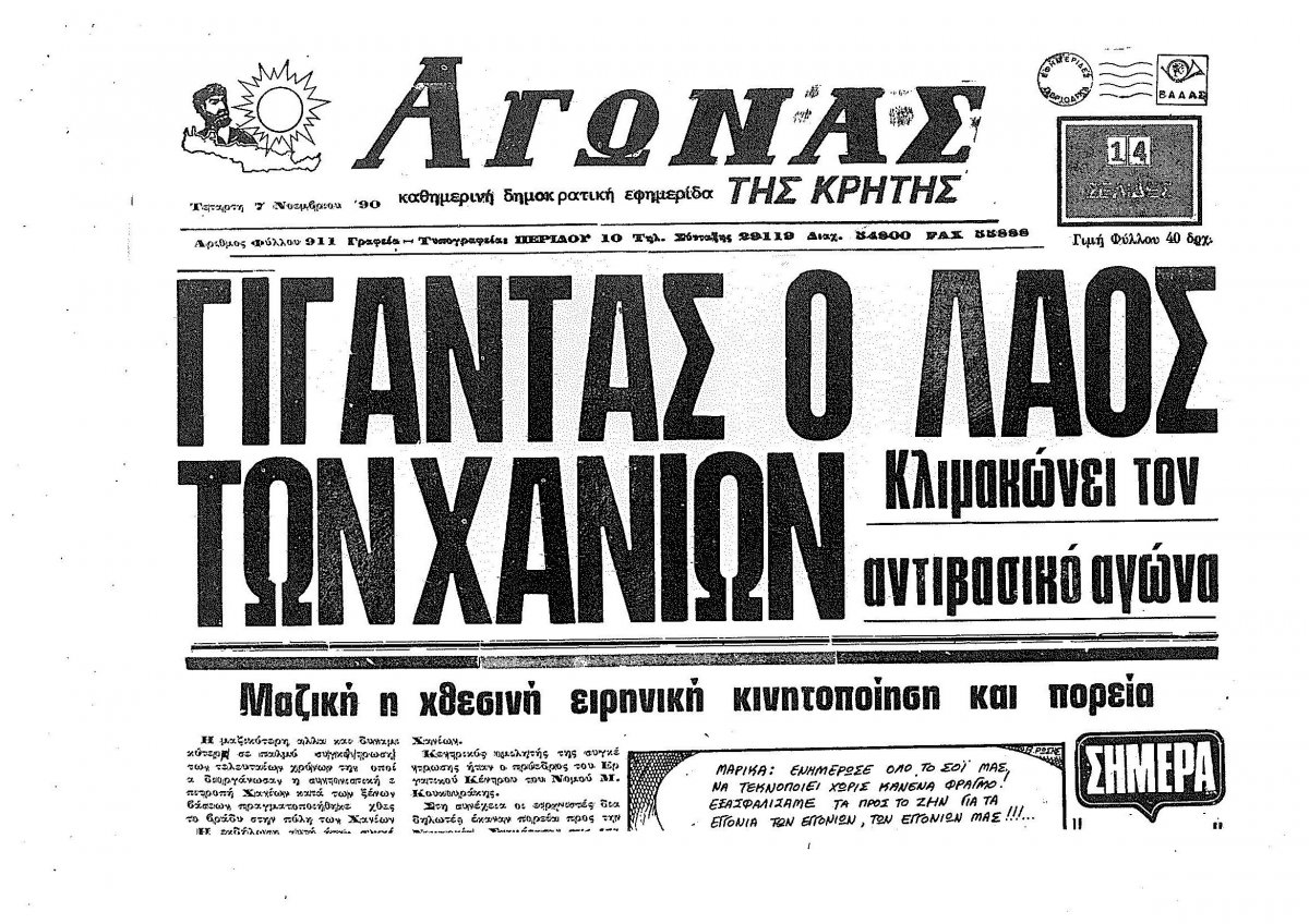 Όταν λοιπόν όλες οι αθηναϊκές εφημερίδες και όλα τα αθηναϊκά κανάλια αλλά και διεθνή μέσα ενημέρωσης – από Ελβετία θυμάμαι μας έπαιρναν τηλέφωνο, από Γερμανία, από Σουηδία, από ΗΠΑ – ενδιαφέρθηκαν για την υπόθεση του αντιβασικού αγώνα και μας ρωτούσαν τι είναι αυτό που έγινε στα Χανιά και έδειχναν εικόνες του συλλαλητηρίου – αυτό ήταν μία αποστωμοτική απάντηση προς όλους όσους δεν ήθελαν να το καταλάβουν: από τη μια πλευρά ήτανε όλος ο λαός κι από την άλλη η κυβερνητική πολιτική.