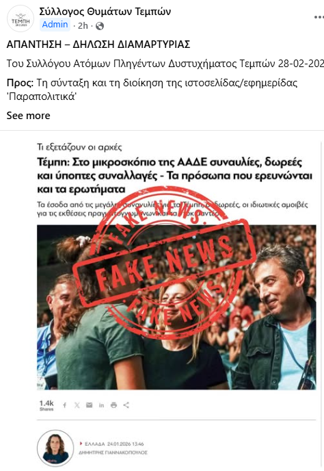 Και διερωτάται «από ποια πηγή αντλεί ο εν λόγω δημοσιογράφος τα παντελώς ψευδή στοιχεία, τα οποία μάλιστα παραπλανητικά παρουσιάζει στο άρθρο του ως αληθή και δεδομένα; Με ποια ιδιότητα και γνώση κρίνει, παραθέτοντας υπαινιγμούς, επί ζητημάτων που αφορούν τη δικαστική διερεύνηση της υπόθεσης των Τεμπών, όπως για παράδειγμα τις αιτίες της έκρηξης – πυρκαγιάς και τη νομική αξία τεχνικών εκθέσεων; Ποια τελικά είναι η στόχευση, αν υπάρχει τέτοια, αυτού του άρθρου, ειδικά στην χρονική περίοδο που διανύουμε και με τις εξελίξεις που έχουμε μπροστά μας;»
