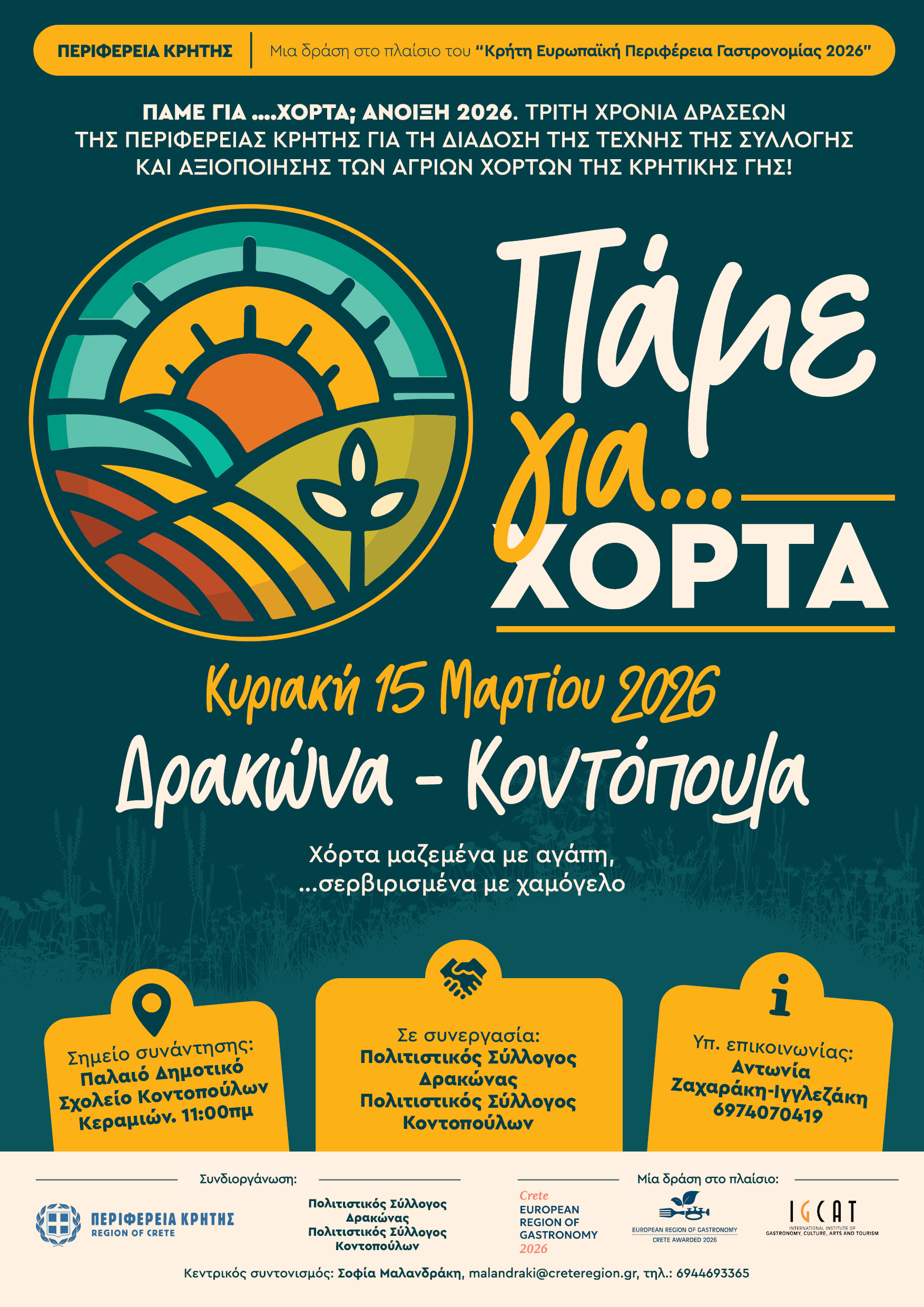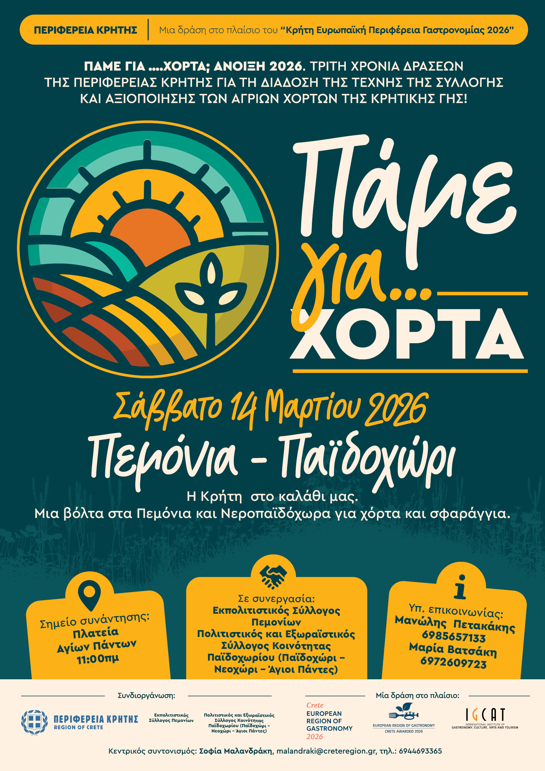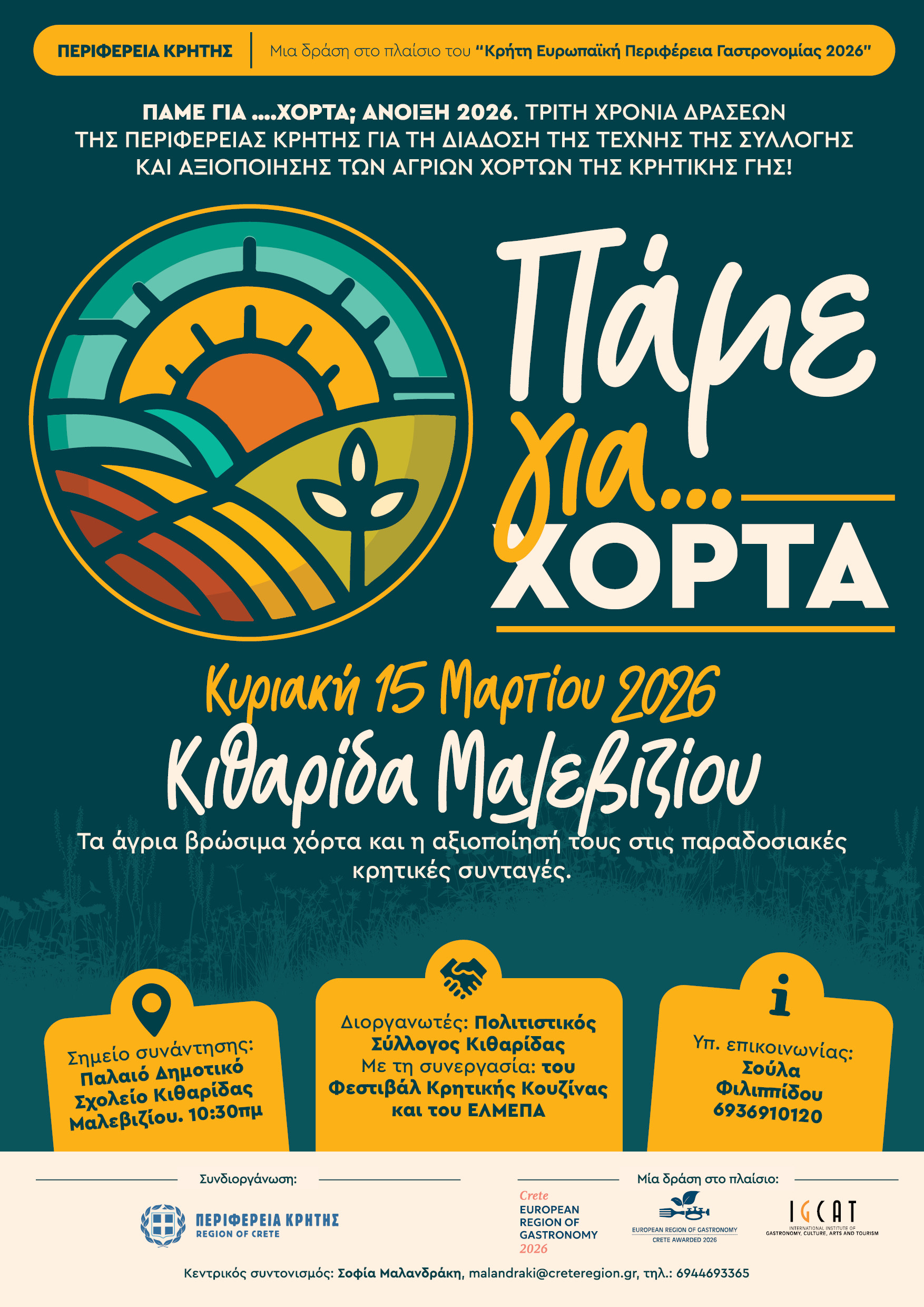 Η Περιφέρεια Κρήτης – Περιφερειακή Ενότητα Χανίων διοργανώνει για τρίτη συνεχή χρονιά το βιωματικό πρόγραμμα δράσεων «Πάμε για… χόρτα», με στόχο τη διάδοση της τέχνης της συλλογής και αξιοποίησης των άγριων χόρτων της Κρητικής γης. Η δράση εντάσσεται, ήδη από το 2025, στο έργο «Κρήτη – Ευρωπαϊκή Περιφέρεια Γαστρονομίας 2026».