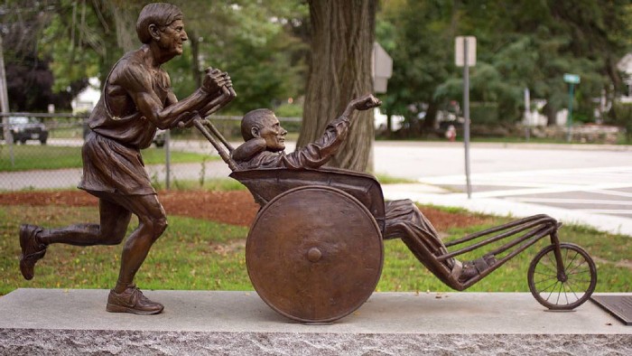 Ο Ντικ έτρεξε μαζί με τον Ρικ 32 φορές στον Μαραθώνιο της Βοστώνης που αποτελούσε και την αγαπημένη τους διαδρομή. Ηταν τόσο γιγαντιαία η προσπάθειά του, που όταν το 2014 αποφάσισε ότι δεν μπορούσε να συνεχίσει, οι διοργανωτές τοποθέτησαν προς τιμήν του ζευγαριού ένα άγαλμά τους στην αφετηρία της διαδρομής. Ενα άγαλμα που όλοι μας θα έπρεπε να κοιτάζουμε ευλαβικά και με αίσθηση μετάνοιας για όλα τα “δεν μπορώ” που είπαμε στη ζωή μας…