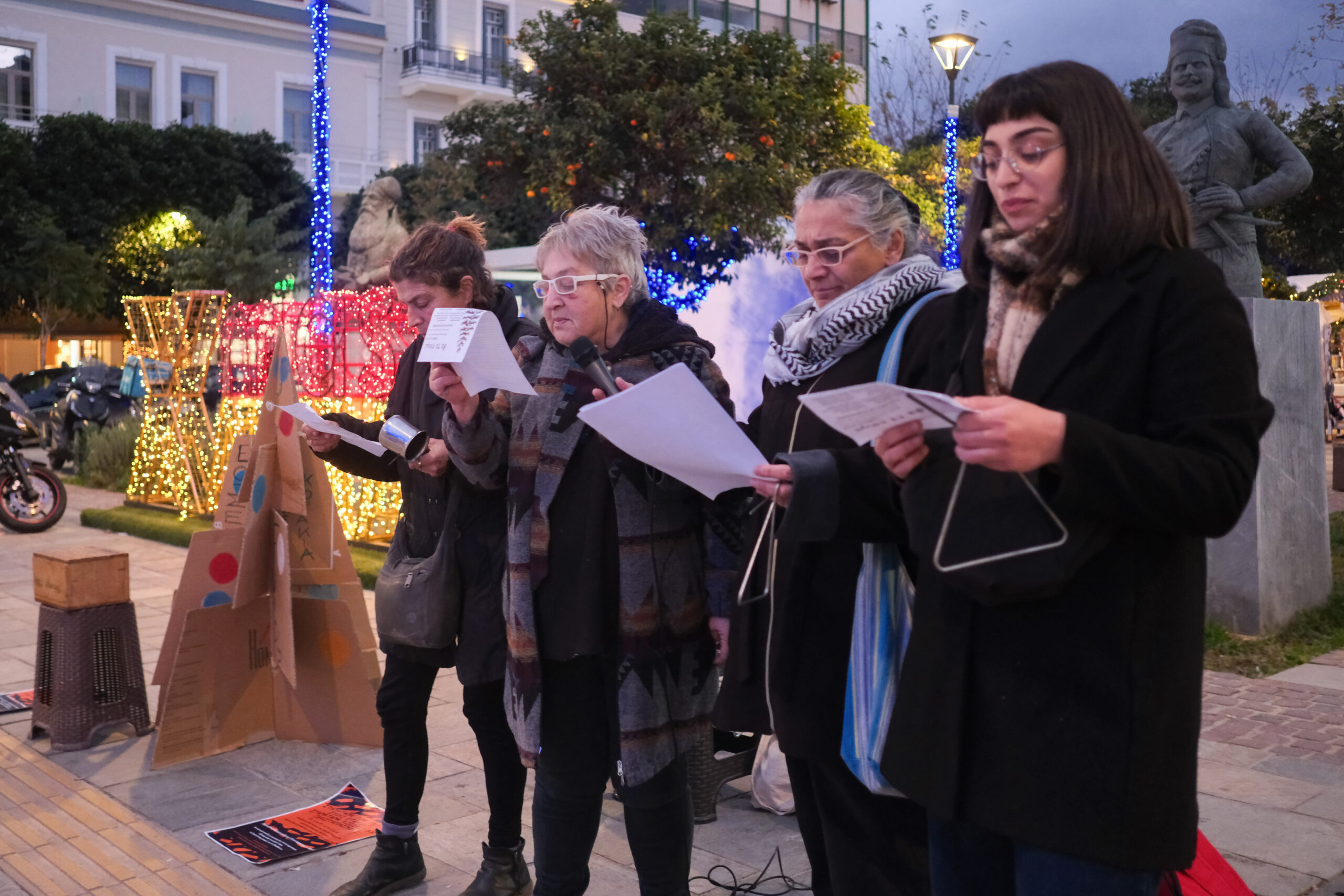 Στο επίκεντρο της παρέμβασης βρέθηκε η αντίθεση ανάμεσα στο εορταστικό κλίμα και την καθημερινότητα χιλιάδων πολιτών. Μέσα από ένα θεατρικό δρώμενο με τέσσερις «καλαντιστές», η Αγωνιστική Κίνηση κατήγγειλε ότι ο εορταστικός διάκοσμος, τα λαμπιόνια και οι στολισμένες βιτρίνες λειτουργούν ως ένα σκηνικό που στήνεται για να τονώσει την ψυχολογία της αγοράς, αλλά ταυτόχρονα «κρύβει την αθλιότητα που ζουν χιλιάδες άνθρωποι σε όλη τη χώρα».
