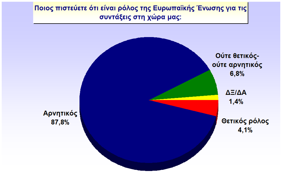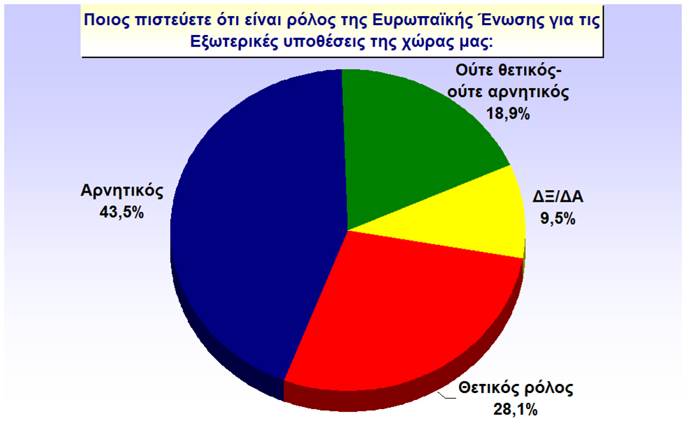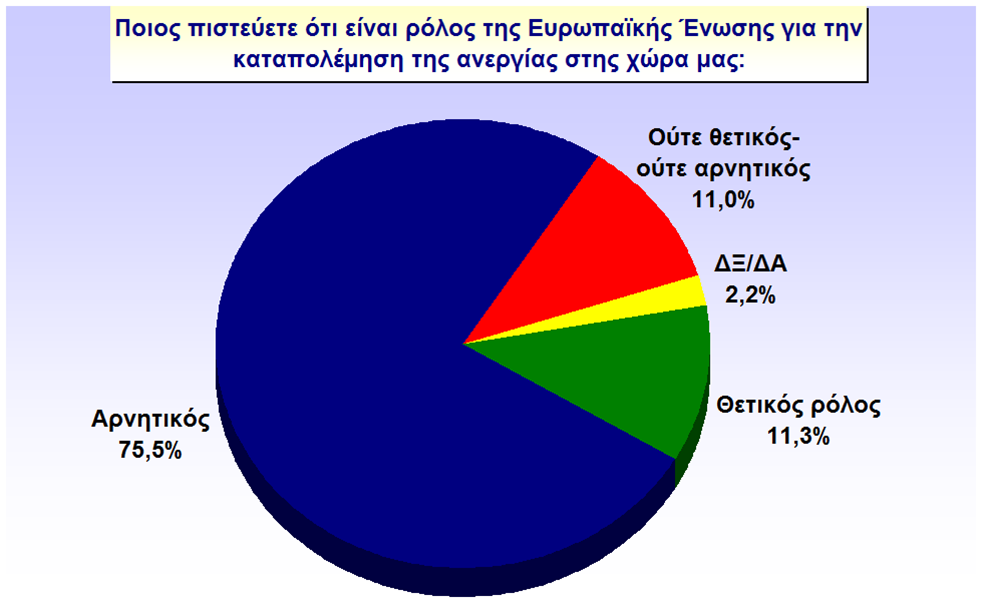 Αντίθετα με την δημόσια τάξη και ασφάλεια οι κρητικοί ενοχοποιούν την ΕΕ για τον καταλυτικό-όπως δείχνουν τα ποσοστά- ρόλο που έχει παίξει στην οικονομία της χώρας μας. Σε ποσοστό 70,6% υποστηρίζουν ότι ο ρόλος της ΕΕ είναι αρνητικός για την χώρα μας, 13,5% θετικός και 13,2 ουδέτερος.