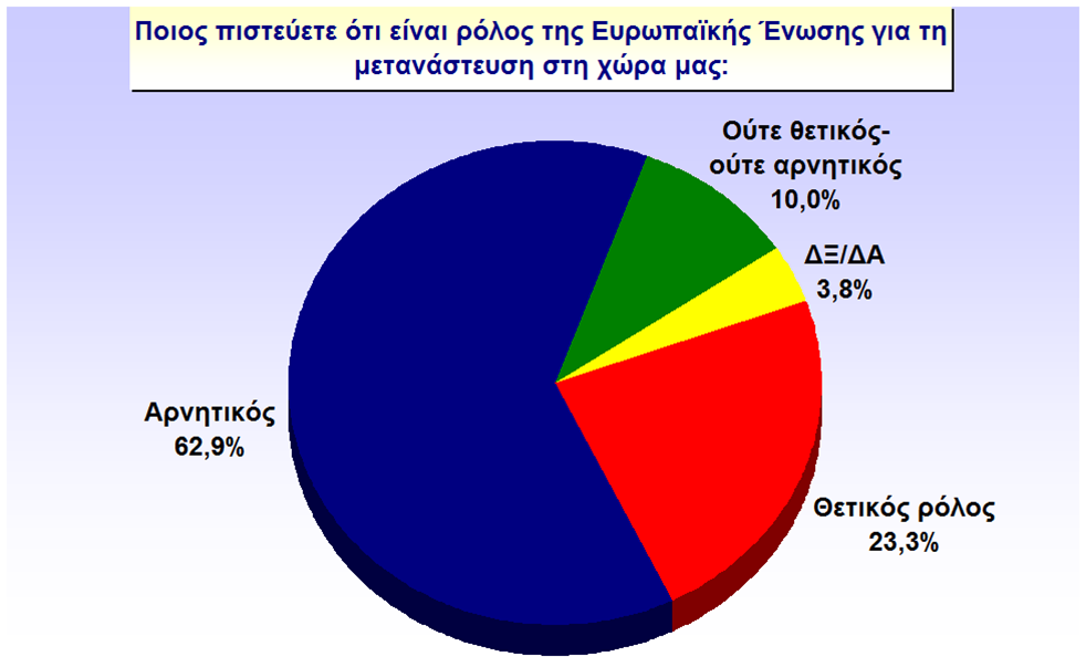 Δυσαρεστημένοι όμως εμφανίζονται οι κρητικοί και για το ρόλο της Ε.Ε στη μετανάστευση καθώς όπως εκτιμούν δεν έχουν εφαρμοστεί κοινές πολιτικές για την αντιμετώπιση της λαθρομετανάστευσης. Σε ποσοστό 62,9% κρίνουν αρνητικά το ρόλο της ΕΕ, 23,3% θετικά και ουδέτερη στάση φαίνεται να κρατά το 10,0% των ερωτηθέντων.