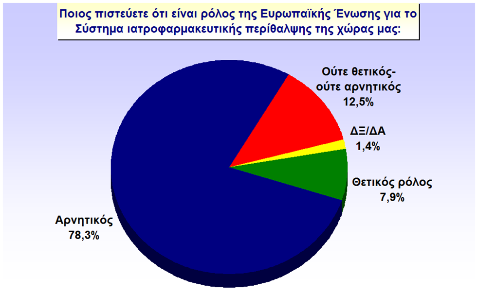 Για τον ευαίσθητο τομέα της υγείας και την ιατροφαρμακευτική περίθαλψη οι κρητικοί στη συντριπτική τους πλειοψηφία χρεώνουν την κακή κατάσταση στην οποία έχει περιέλθει στην ΕΕ και στις πολιτικές της που εφαρμόζονται, λόγω κρίσης, στη χώρα μας. Οι αρνητικές γνώμες αποτυπώθηκαν σε ποσοστό 78,3%, 7,9% ήταν αυτοί που βλέπουν θετικά το ρόλο της ΕΕ στην υγεία των Ελλήνων και 12,5% των πολιτών θεώρησαν ουδέτερη την επιρροή της ΕΕ στο ευαίσθητο θέμα της  ιατροφαρμακευτικής περίθαλψης στη χώρα μας.