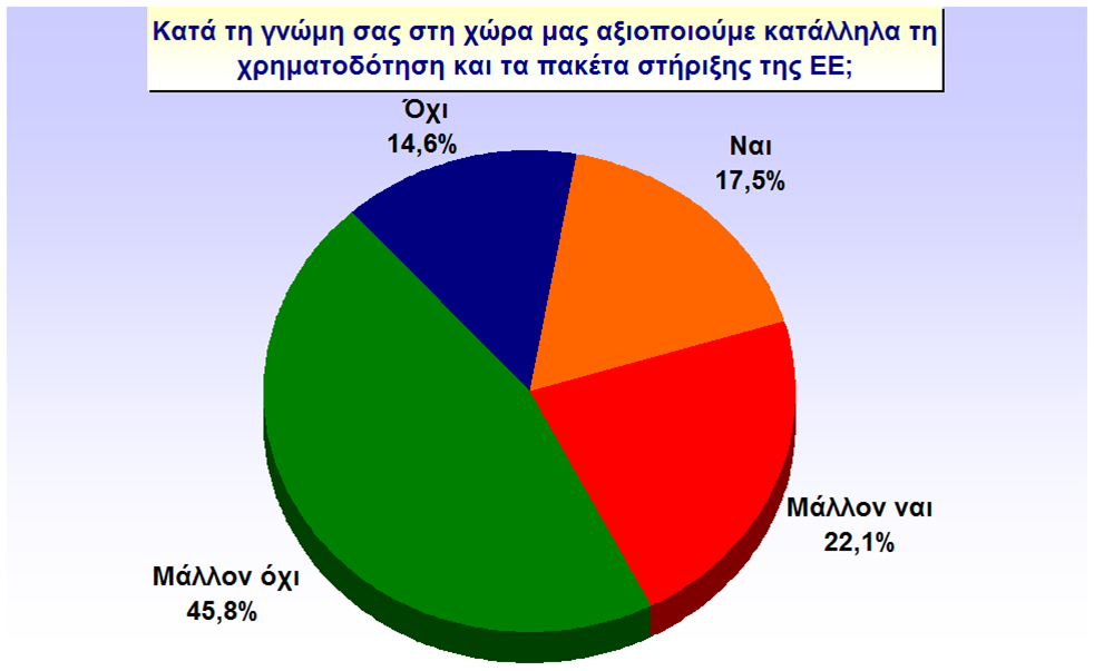 Οι κατά καιρούς αποκαλύψεις για τους τρόπους που αξιοποιούνται τα κοινοτικά κονδύλια κάνουν επιφυλακτικούς τους Κρητικούς που ρωτήθηκαν κατά τη δημοσκόπηση. Όπως χαρακτηριστικά σημειώνεται από την ανάλυση των δεδομένων η γνώμη των πολιτών για την αξιοποίηση της χρηματοδότησης και των πακέτων στήριξης της ΕΕ στη χώρα μας είναι αρκετά ενδιαφέρουσα, αφού σε ποσοστό 60,4% οι πολίτες πιστεύουν ότι δεν αξιοποιούμε σωστά τη βοήθεια από την ΕΕ. Αντίθετη άποψη για την αξιοποίηση των Ευρωπαϊκών πόρων  από τη χώρα μας φαίνεται να έχει το 39,6% του δείγματος.
