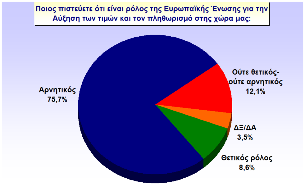 Στην ΕΕ οι κρητικοί χρεώνουν επίσης και μάλιστα σε μεγάλο ποσοστό την αύξηση των τιμών που επικρατούν στην ελληνική αγορά καθώς πιστεύουν ότι ο ρόλος της στη διαμόρφωση των τιμών που φτάνουν στον καταναλωτή είναι καθοριστικός. Αντίστοιχη είναι η θέση τους και για τον πληθωρισμό. Το 75,7% του δείγματος δήλωσε ότι ο ρόλος της ΕΕ είναι αρνητικός και μόλις το 8,6% θετικός.