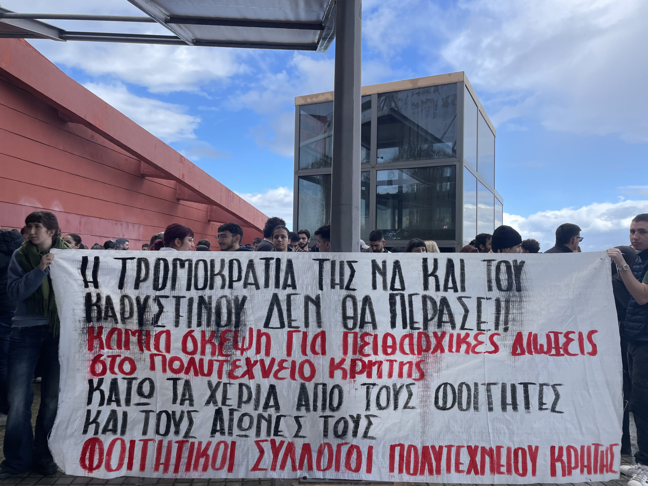 Σε πεδίο έντονης αντιπαράθεσης μεταξύ της φοιτητικής κοινότητας και της διοίκησης του Ιδρύματος μετατράπηκε το Πολυτεχνείο Κρήτης, με αφορμή τις διαδοχικές κλήσεις φοιτητών σε πειθαρχικά συμβούλια και ποινικά δικαστήρια. Η σημερινή συγκέντρωση έξω από το κτίριο του ΗΜΜΥ αποτελεί την κορύφωση μιας σειράς αντιδράσεων που ξεκίνησαν μετά την απόφαση του Κοσμήτορα της σχολής, Γιώργου Καρυστινού, να παραπέμψει επτά φοιτητές σε πειθαρχική ακρόαση.