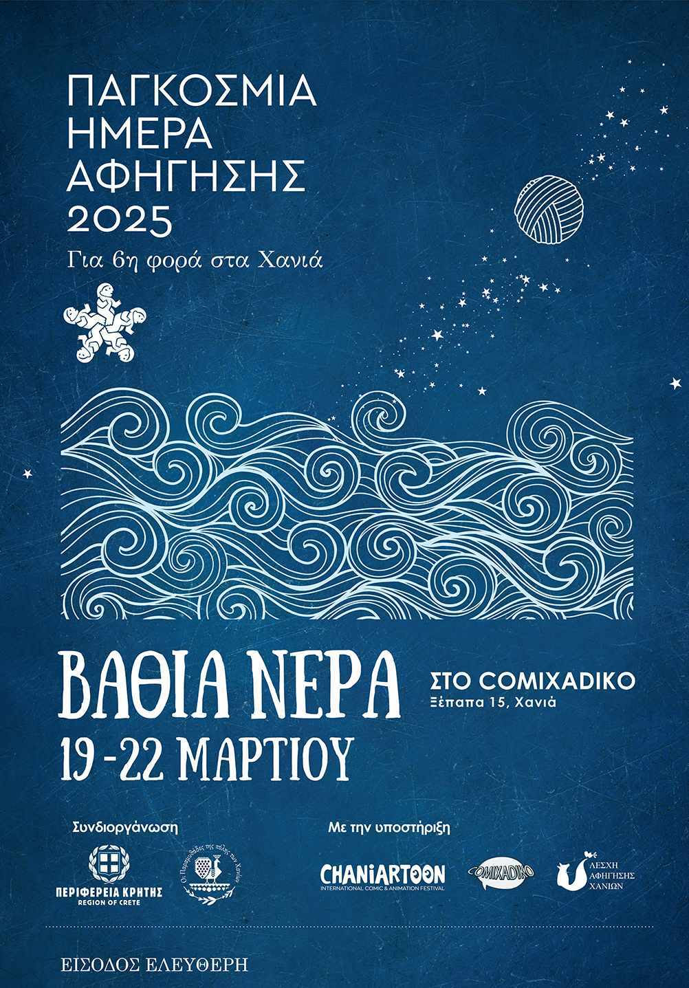 Οι «Παραμυθάδες της πόλης των Χανίων», σε συνδιοργάνωση με την Περιφέρεια Κρήτης, το Chaniartoon και το Comixadiko, τιμούν την Παγκόσμια Ημέρα Αφήγησης με μια σειρά εκδηλώσεων από την Τετάρτη 19 έως και το Σάββατο 22 Μαρτίου 2024. Οι δράσεις θα πραγματοποιηθούν στο Comixadiko και στο θέατρο FATOUM the theatre, με θεματική «Βαθιά Νερά».