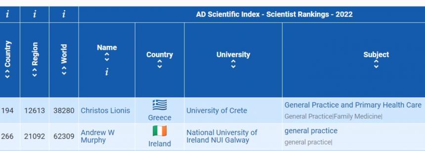 Στην πρώτη θέση στον παγκόσμιο κατάλογο των επιστημόνων – ερευνητών των σχετικών με την γενική ιατρική (general practice), κατατάσσεται το δημοσιευμένο έργο του καθηγητή Γενικής Ιατρικής Χρήστου Λιονή.