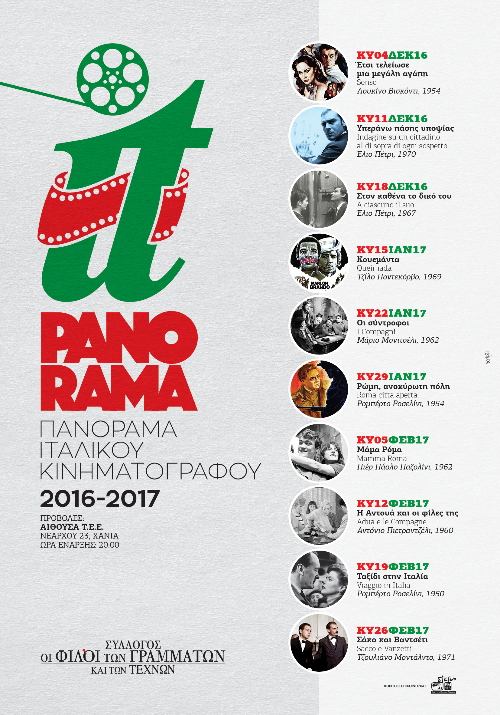 Ο πολιτιστικός σύλλογος “ΟΙ ΦΙΛΟΙ ΤΩΝ ΓΡΑΜΜΑΤΩΝ ΚΑΙ ΤΩΝ ΤΕΧΝΩΝ” δίνοντας για πέμπτη χρονιά το παρόν στα κινηματογραφικά δρώμενα της πόλης των Χανίων, σε συνεργασία και με την New Star συνεχίζει και αυτόν τον χειμώνα το “ΠΑΝΟΡΑΜΑ ΙΤΑΛΙΚΟΥ ΚΙΝΗΜΑΤΟΓΡΑΦΟΥ” με σπάνιες ταινίες ποιότητας καταξιωμένων Ιταλών σκηνοθετών που θα προβάλλονται κάθε Κυριακή στις 20.00μ.μ. στη φιλόξενη αίθουσα ορόφου του Τ.Ε.Ε. Δυτικής Κρήτης (Νεάρχου 23, είσοδος από Γιαμπουδάκη).