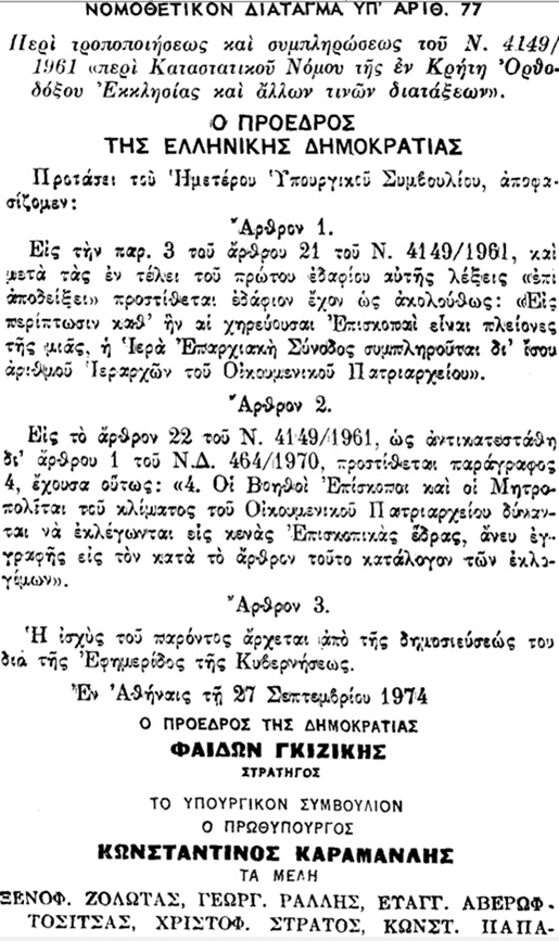 Δὲν πρόλαβε νὰ ἀναλάβῃ ὁ ἐκ Γαλλίας ἀφιχθεῖς προσκεκλημένος τῆς Χούντας τοῦ Ἰωαννίδη κ. Κωνσταντῖνος Καραμανλῆς καὶ ἀποφασίζει καὶ νομοθετεῖ ἐναντίον τῆς Ἐκκλησίας τῆς Κρήτης καὶ ὑπὲρ τοῦ Πατριαρχείου. Καὶ μάλιστα νομοθετεῖ τὴν δυνατότητα παρεμβάσεως τοῦ Πατριαρχείου στὴν ἐκλογὴ τῶν ἐπισκόπων τῆς Κρήτης. Ἕτοιμα τὰ εἶχε ἀπὸ τὴν Γαλλία; Ἴσως.
