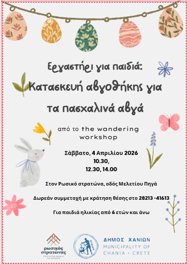 Το Σάββατο 4 Απριλίου διοργανώνονται δύο σημαντικές δράσεις. Στις 11:00, ο επιμελητής Κωνσταντίνος Β. Πρώιμος θα πραγματοποιήσει ξενάγηση στην έκθεση «Red Line – Κόκκινη γραμμή – Ligne rouge» στη Δημοτική Πινακοθήκη Χανίων. Παράλληλα, στον Ρωσικό Στρατώνα λειτουργεί πασχαλινό εργαστήρι για παιδιά με θέμα την κατασκευή αυγοθήκης για τα πασχαλινά αυγά, σε τρία τμήματα (10:30-12:00, 12:30-14:00, 14:00-15:30). Η συμμετοχή είναι δωρεάν για παιδιά από 6 ετών και άνω, με απαραίτητη κράτηση στο τηλέφωνο 28213 41613.