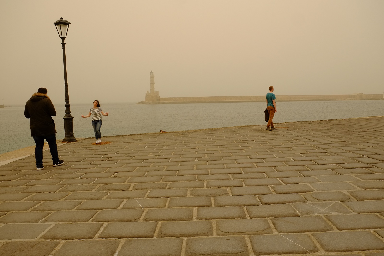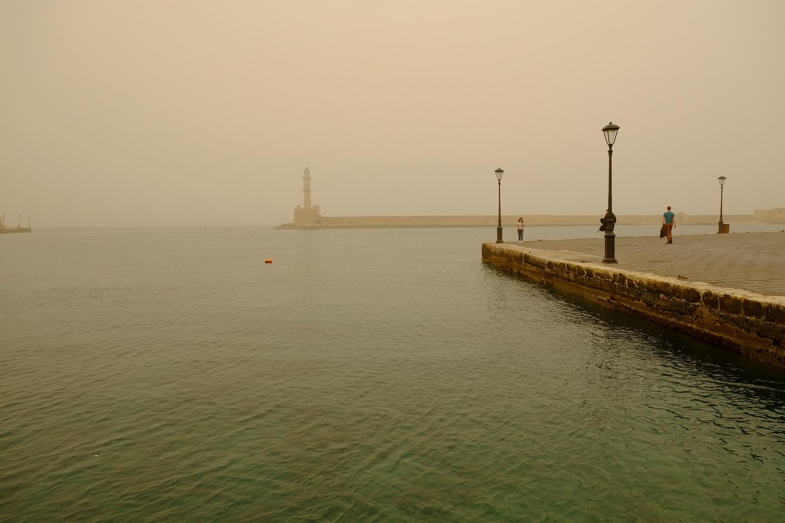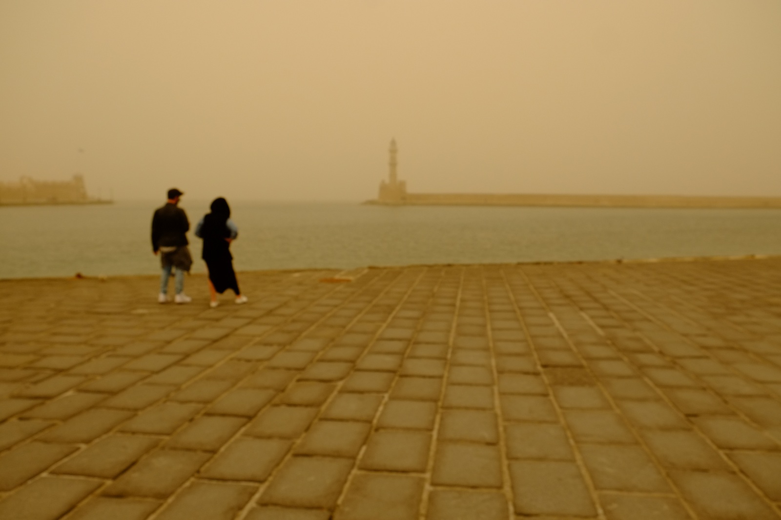 Στο Παλιό Λιμάνι πολλοί σταματούν για να δουν το φάρο και θάμπωσε και κρύφθηκε πίσω από τον πυκνό μανδύα σκόνης που γέμισε τον ουρανό των Χανίων.