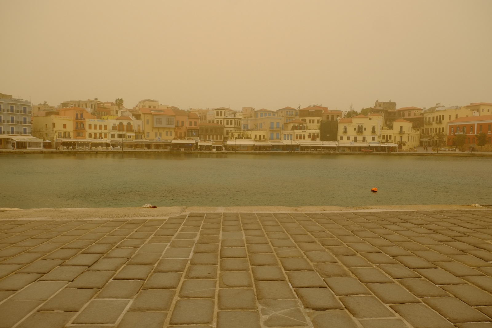 Κίτρινο και σκονισμένο το Παλιό Λιμάνι Χανίων σήμερα από την σκόνη που μεταφέρεται από την Αφρική με τους ισχυρούς νοτιάδες.