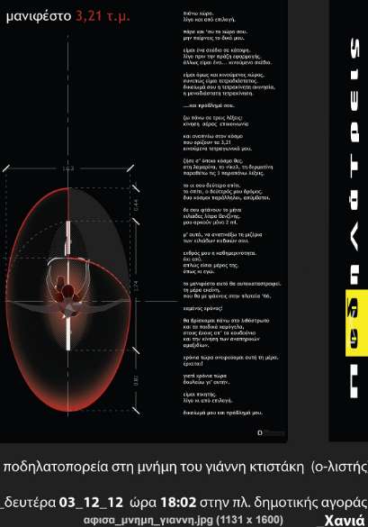 Εμείς, τελειώνουμε τη σύντομη αναφορά μας με το κείμενο της αφίσας, κείμενο που είχε γράψει ο Γιάννης Κτιστάκης στο blog του «δρομοκράτης» και έχει τον τίτλο «μανιφέστο 3,21 τ.μ.»: