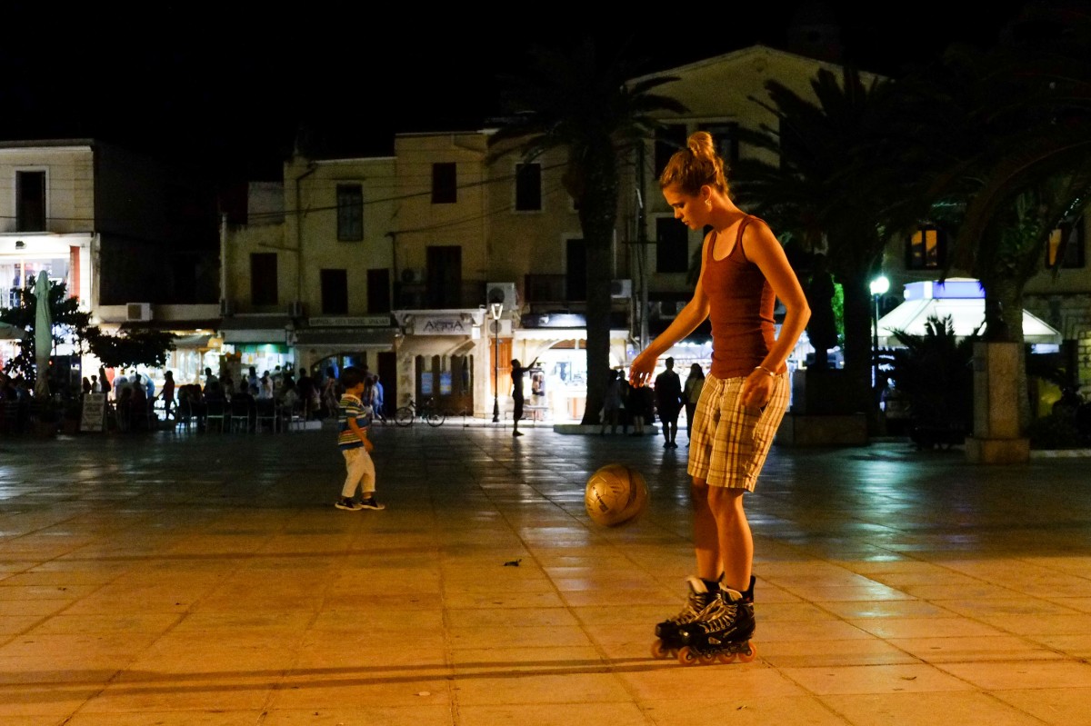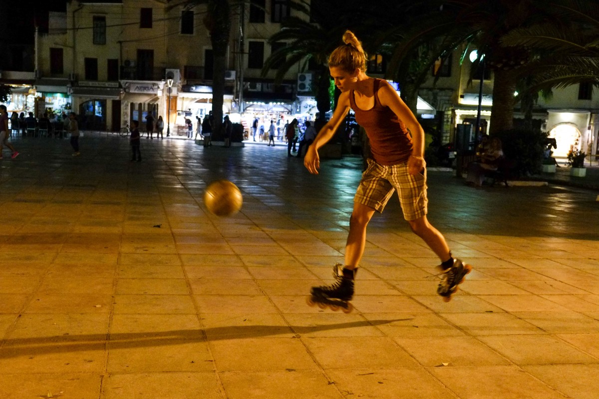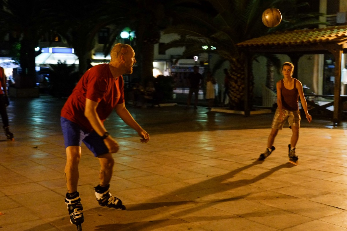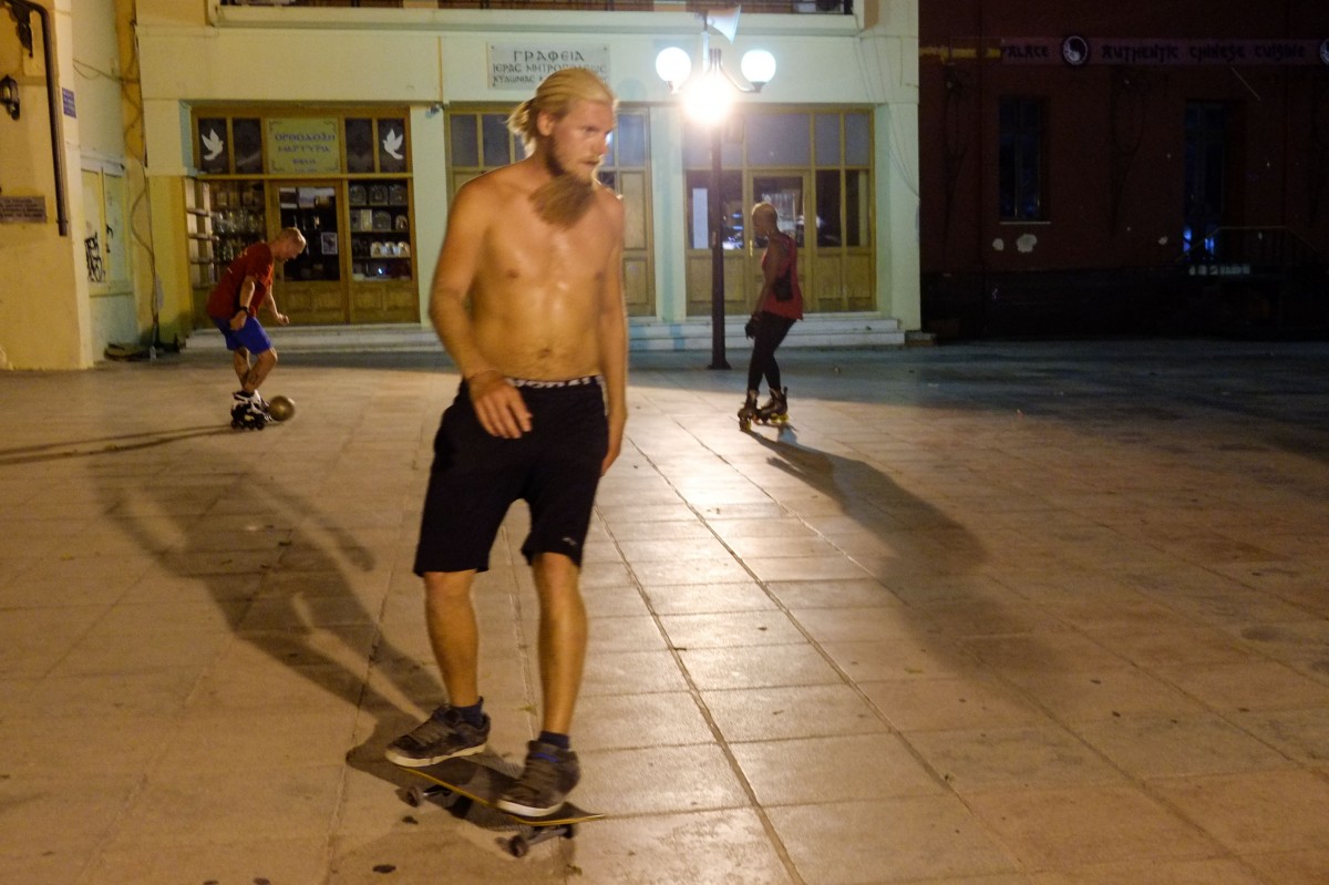Ένα περίεργο θέαμα παρακολούθησαν όσοι έτυχε να βρίσκονται στην πλατεία της Μητρόπολης Χανίων την Τετάρτη το βράδυ. Μία παρέα νέων ανθρώπων από τις ΗΠΑ έπαιζαν ένα φαινομενικά αταίριαστο συνδυασμό, λες και για να κάνουν δύσκολη τη ζωή τους: ποδόσφαιρο με πατίνια.