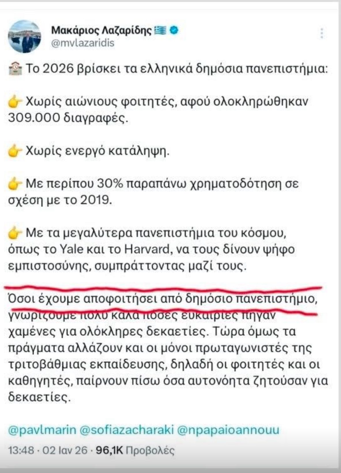 ΤΟ ΠΙΟ ΧΥΔΑΙΟ ΚΑΙ ΠΡΟΚΛΗΤΙΚΟ ΟΜΩΣ ειναι να συγκρίνει κανείς αυτα που λέει τωρα ,με την αναρτηση του στο Χ στις 2 Ιανουαριου 2026 οπου υπερθεματιζει για τις διαγραφες «αιωνιων φοιτητων»,αυτος «ΠΟΥ ΕΧΕΙ ΣΠΟΥΔΑΣΕΙ ΣΕ ΔΗΜΟΣΙΟ ΠΑΝΕΠΙΣΤΗΜΙΟ»!!!!!!!!!!!!!!!!!(φωτο 3)
