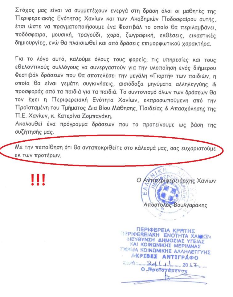 Να σημειώσουμε ότι την Τετάρτη 1 Φεβρουαρίου πραγματοποιήθηκε ευρεία σύσκεψη στην αίθουσα συνεδριάσεων της Περιφερειακής Ενότητας Χανίων σχετικά με τη διεξαγωγή του 2ου Παγχανιώτικου Τουρνουά Ποδοσφαίρου με τίτλο: Πολλά Χαμόγελα για το «Χαμόγελο».