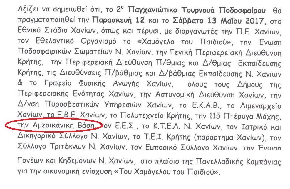 Ο κ. Νίκος Ζωγραφάκης, μέλος του Εμπορικού Συλλόγου Χανίων δημοσιοποίησε έγγραφο που στάλθηκε και προς τον Εμπορικό Σύλλογο όπου μεταξύ των διοργανωτών της εκδήλωσης φέρεται να είναι και η “Αμερικάνικη Βάση”, δίπλα από τον Ερυθρό Σταυρό, το Πολυτεχνείο Κρήτης, το ΕΚΑΒ, τον Σύλλογο Τρίτεκνων αλλά και τον Εμπορικό Σύλλογο Χανίων.