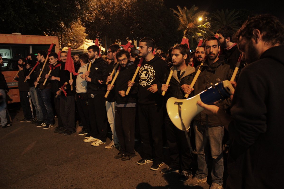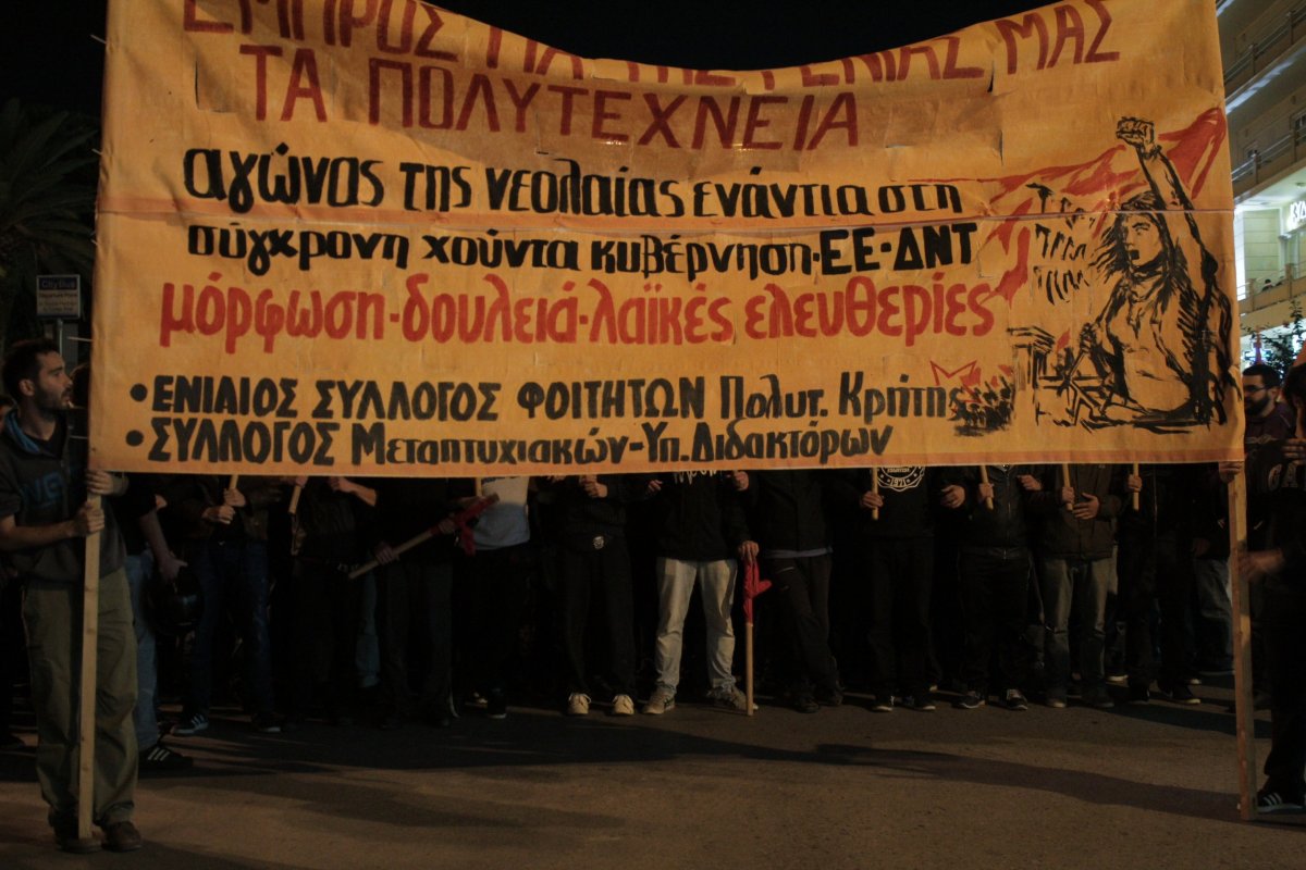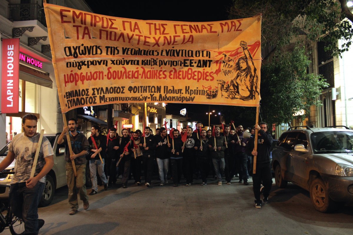 Νωρίτερα, η Πλατεία Αγοράς είχε γεμίσει από 500 πολίτες των Χανίων που συγκέντρωθηκαν σήμερα το απόγευμα, για να συμμετάσχουν στην πορεία για την 41η επέτειο από την εξέγερση του Πολυτεχνείου.