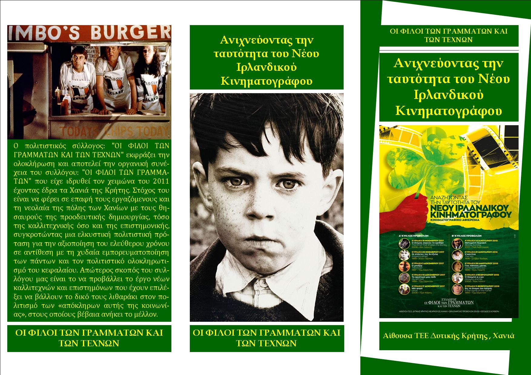 Ο πολιτιστικός σύλλογος “ΟΙ ΦΙΛΟΙ ΤΩΝ ΓΡΑΜΜΑΤΩΝ ΚΑΙ ΤΩΝ ΤΕΧΝΩΝ” στα πλαίσια του αφιερώματος στο Ιρλανδικό σινεμά που φέρει τον τίτλο: “Ανιχνεύοντας την ταυτότητα του Νέου Ιρλανδικού Κινηματογράφου” θα προβάλλει την Κυριακή, 03 Δεκεμβρίου 2017 στη φιλόξενη αίθουσα ορόφου του Τ.Ε.Ε. Δυτικής Κρήτης (Νεάρχου 23, είσοδος από Γιαμπουδάκη) στις 20.00μ.μ. την ταινία του Τζιμ Σέρινταν “Ο μποξέρ”, παραγωγής του 1997. Την ταινία θα προλογήσει ο εκπαιδευτικός Χρήστος Δερμιτζάκης.