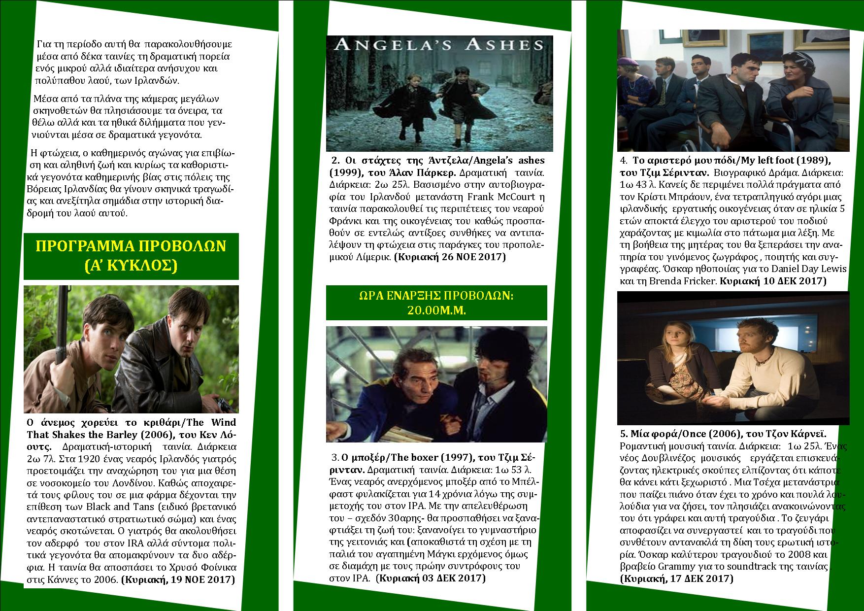 Ο πολιτιστικός σύλλογος “ΟΙ ΦΙΛΟΙ ΤΩΝ ΓΡΑΜΜΑΤΩΝ ΚΑΙ ΤΩΝ ΤΕΧΝΩΝ” στα πλαίσια του αφιερώματος στο Ιρλανδικό σινεμά που φέρει τον τίτλο: “Ανιχνεύοντας την ταυτότητα του Νέου Ιρλανδικού Κινηματογράφου”  θα προβάλλει την Κυριακή, 03 Δεκεμβρίου 2017 στη φιλόξενη αίθουσα ορόφου του Τ.Ε.Ε. Δυτικής Κρήτης (Νεάρχου 23, είσοδος από Γιαμπουδάκη) στις 20.00μ.μ. την ταινία του Τζιμ Σέρινταν “Ο μποξέρ”, παραγωγής του 1997. Την ταινία θα προλογήσει ο εκπαιδευτικός Χρήστος Δερμιτζάκης.