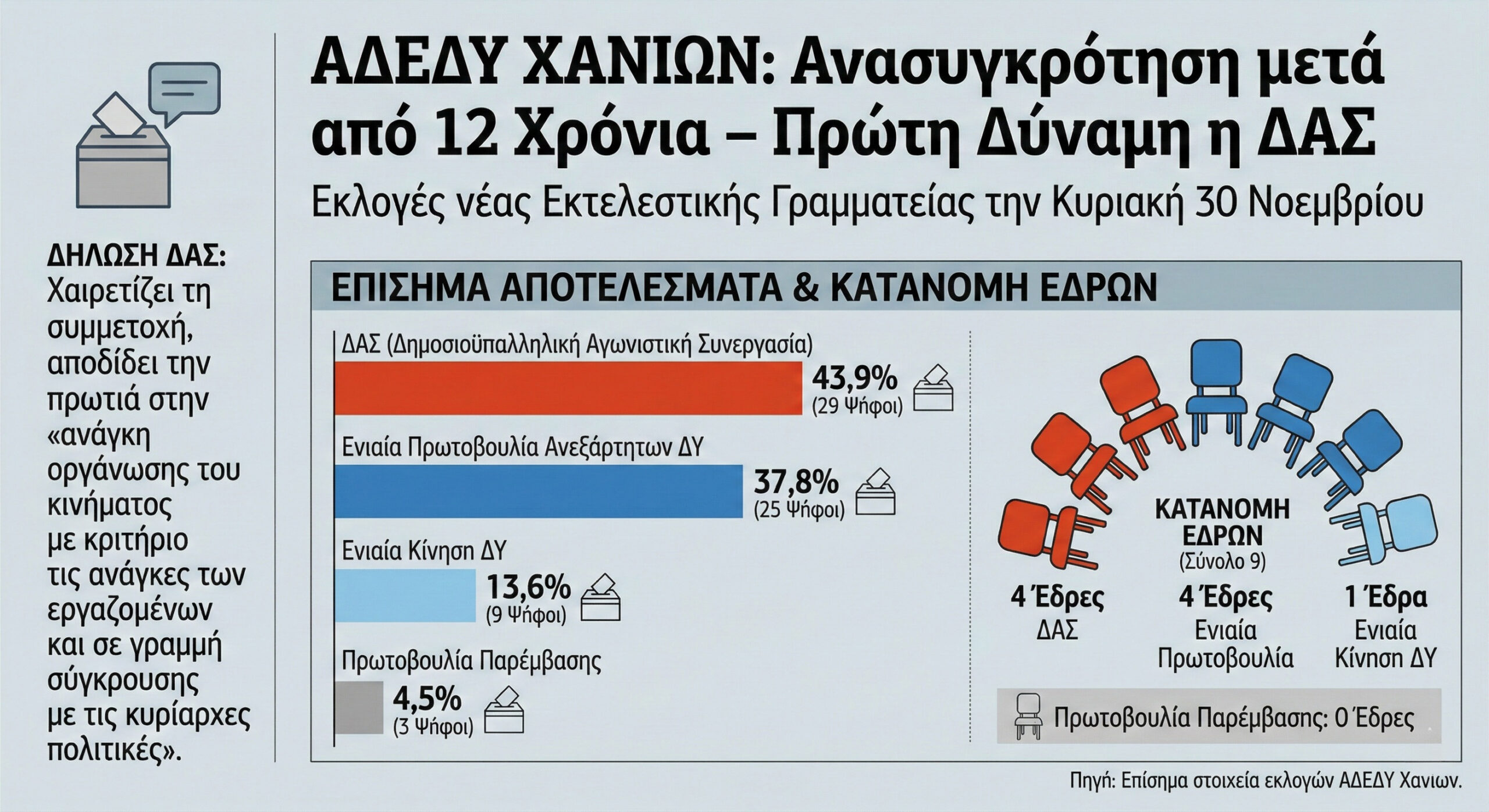 Πρωτιά της ΔΑΣ στις εκλογές για τη νέα Εκτελεστική Γραμματεία του ΝΤ Χανίων της ΑΔΕΔΥ