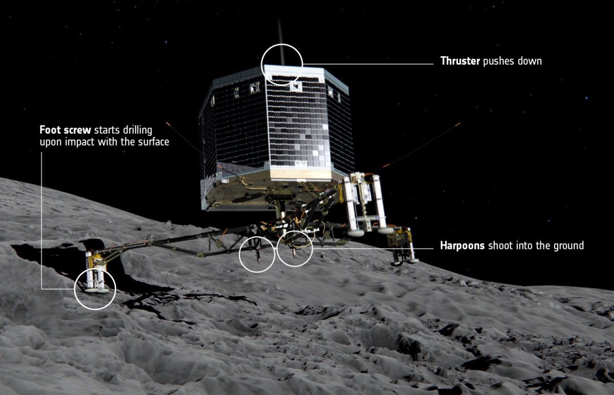 Σύμφωνα, πάντα, με την ESA, το ρομποτικό ανιχνευτικό σκάφος Rosetta θα αποδεσμεύσει το σκάφος προσεδάφισης Philae, που έχει μέγεθος όσο ένα πλυντήριο ρούχων και βάρος 100 κιλά, περίπου 22,5 χλμ. από το κέντρο του κομήτη.