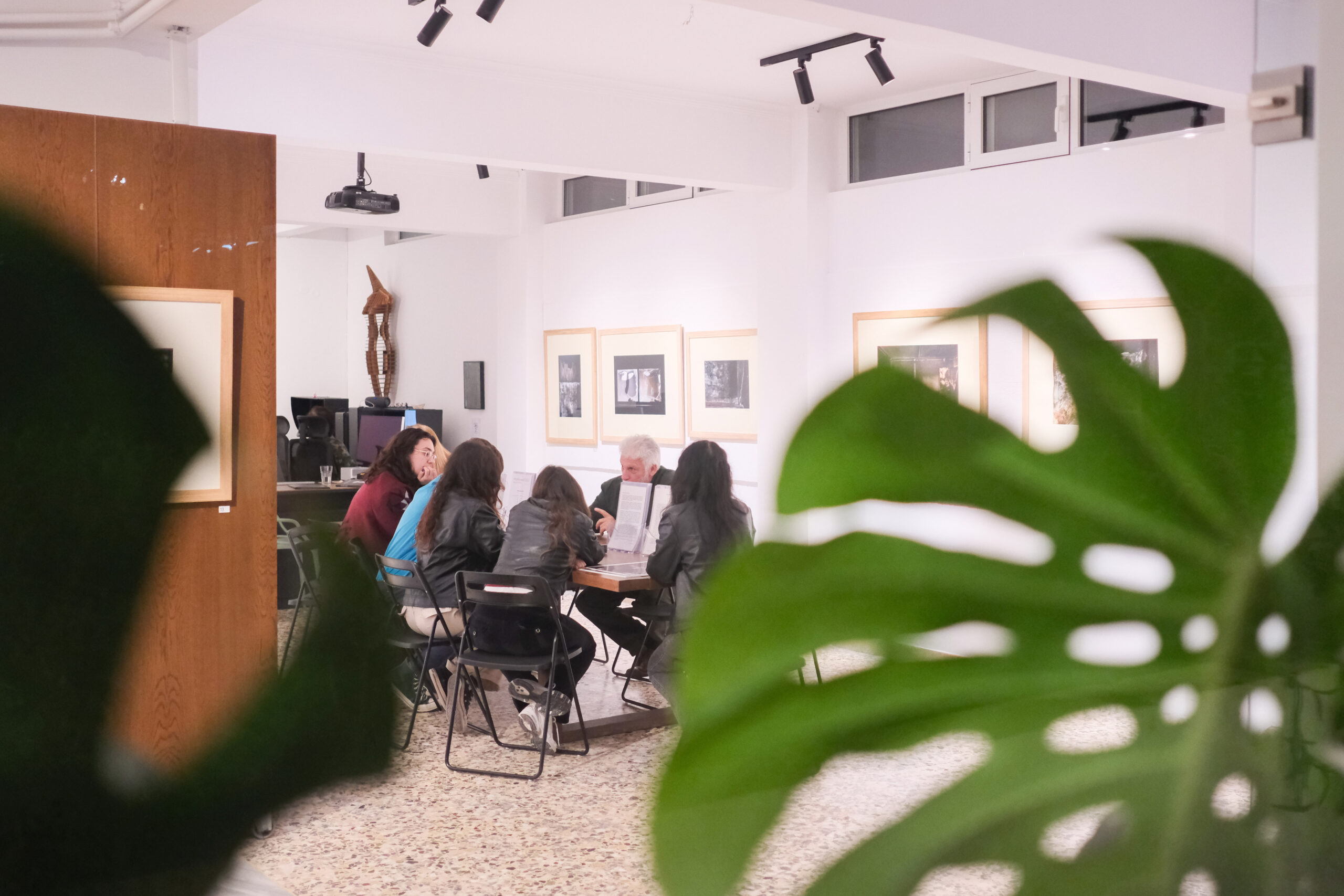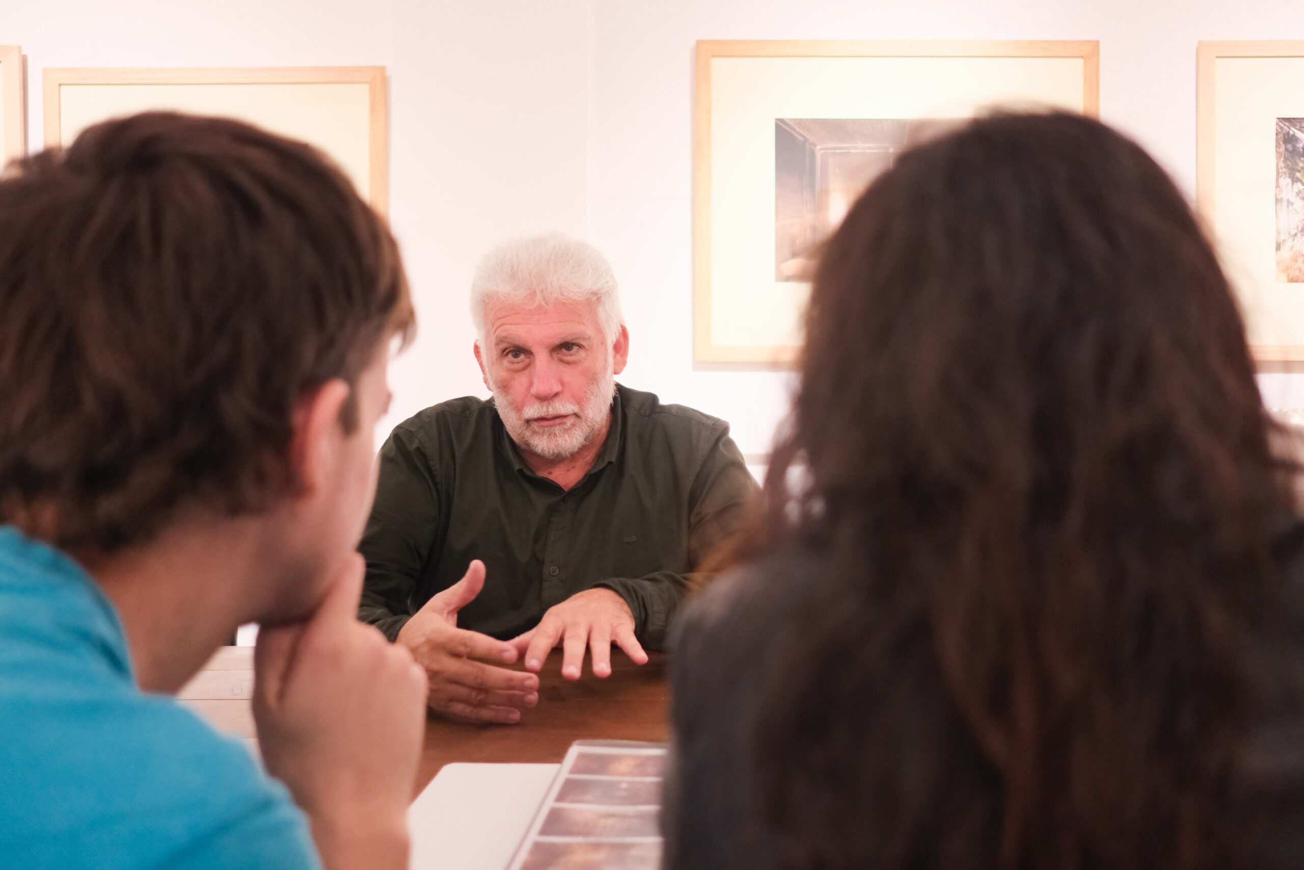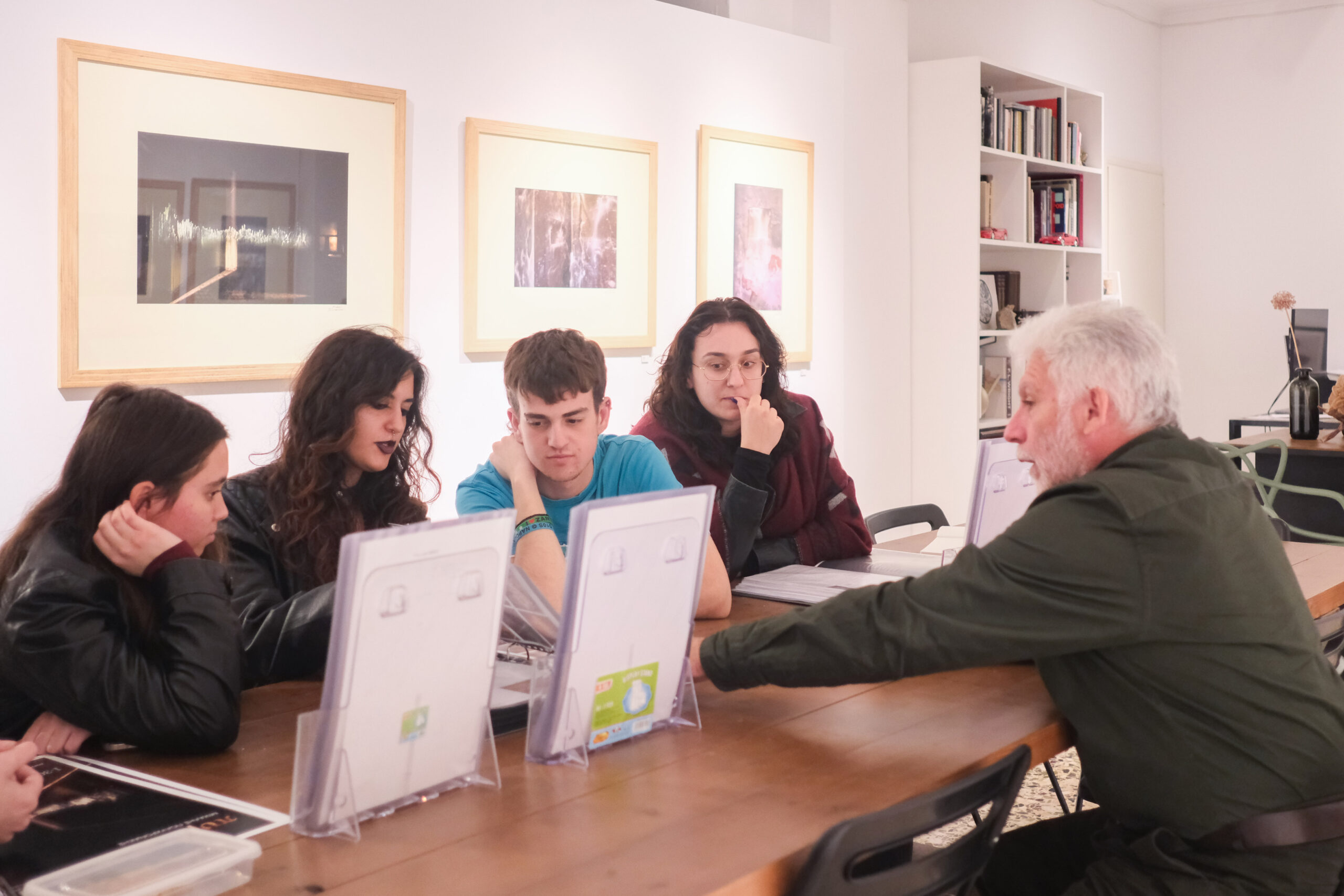 (Στις φωτογραφίες ο Μ. Πολυχρονάκης σε συζήτηση με μαθητές του τμήματος φωτογραφίας του ΔΙΕΚ Χανίων στον χώρο της έκθεσης)