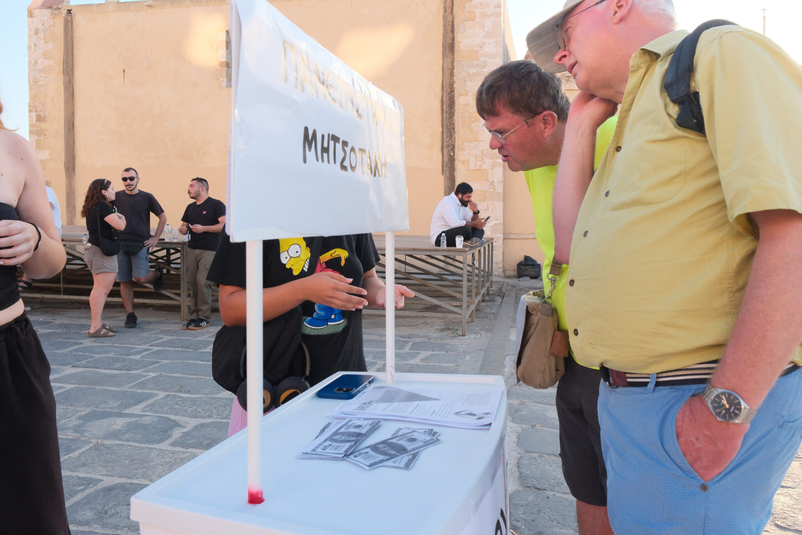 Στο κέντρο της δράσης βρέθηκε ένα αυτοσχέδιο κιόσκι με την επιγραφή «Ιδιωτικά πανεπιστήμια», απ’ όπου οι φοιτητές μοίραζαν ενημερωτικό υλικό στους περαστικούς. Παράλληλα, είχαν τυπώσει χαρτονομίσματα με το πρόσωπο του πρωθυπουργού Κυριάκου Μητσοτάκη, θέλοντας να υπογραμμίσουν –όπως τόνιζαν– ότι η ανώτατη εκπαίδευση μετατρέπεται σε εμπόρευμα με υψηλό αντίτιμο.