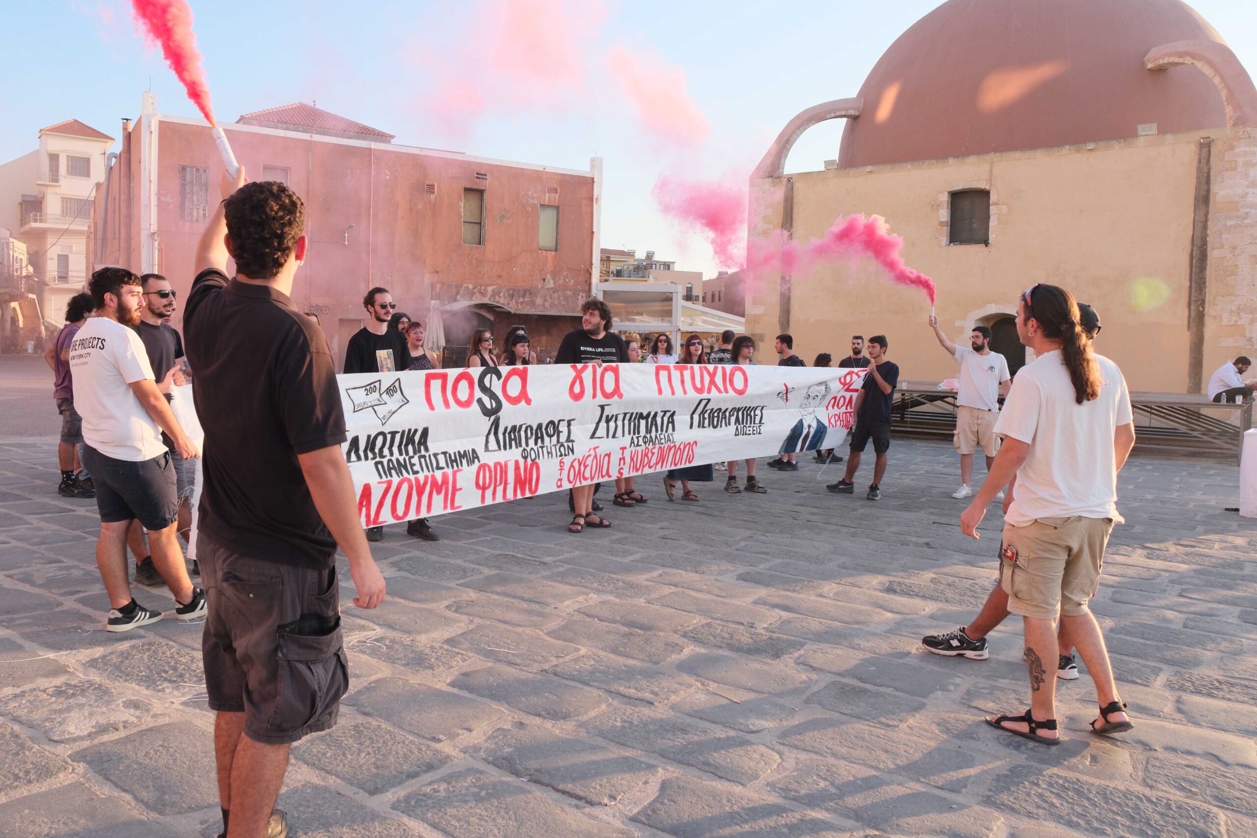 Η Δευτέρα 15 Σεπτεμβρίου βρήκε τα φοιτητικά κινήματα σε όλη την Ελλάδα στους δρόμους, στο πλαίσιο της πανελλαδικής ημέρας δράσης ενάντια στην ίδρυση ιδιωτικών πανεπιστημίων. Στα Χανιά, οι φοιτητές έδωσαν το δικό τους ραντεβού στις 18.00 στο Παλιό Λιμάνι, μπροστά στο Γυαλί Τζαμί, επιλέγοντας έναν τρόπο διαμαρτυρίας που συνδύαζε κέφι, δημιουργικότητα και σαρκασμό απέναντι στην κυβερνητική πολιτική.