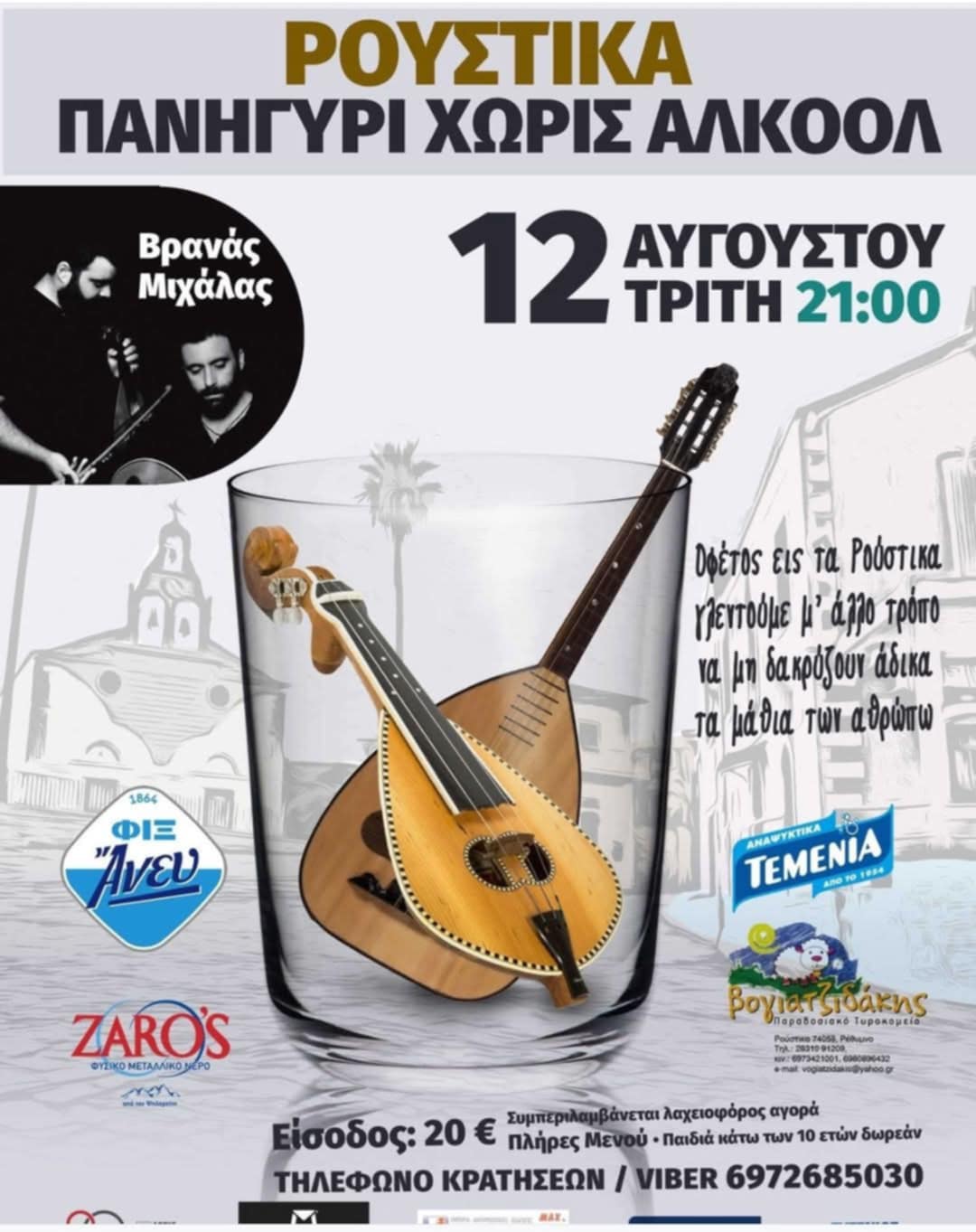 Μια ξεχωριστή εκδήλωση διοργανώνεται φέτος στα Ρουστικά Ρεθύμνου, την Τρίτη 12 Αυγούστου, στις 21:00, με το μήνυμα της διασκέδασης χωρίς αλκοόλ. Το «Πανηγύρι χωρίς αλκοόλ» φιλοδοξεί να προσφέρει μια βραδιά γεμάτη μουσική, χορό και παραδοσιακές γεύσεις, αποδεικνύοντας ότι η διασκέδαση μπορεί να είναι αυθεντική και χωρίς οινοπνευματώδη ποτά.