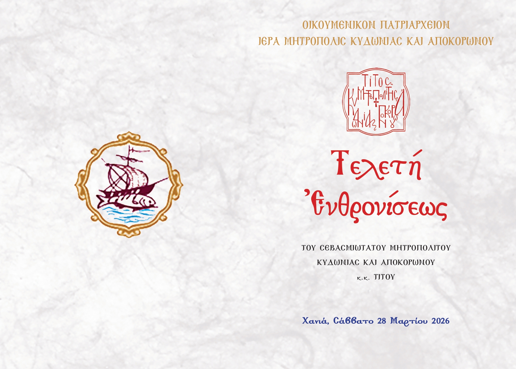 Με λαμπρότητα θα υποδεχθούν τα Χανιά το Σάββατο 28 Μαρτίου 2026 τον νέο Ποιμενάρχη της πόλης, Σεβασμιωτάτο Μητροπολίτη Κυδωνίας και Αποκορώνου κ. Τίτο, σε μια ιστορική τελετή που θα συγκεντρώσει εκκλησιαστικές και πολιτικές αρχές από όλη την Κρήτη.