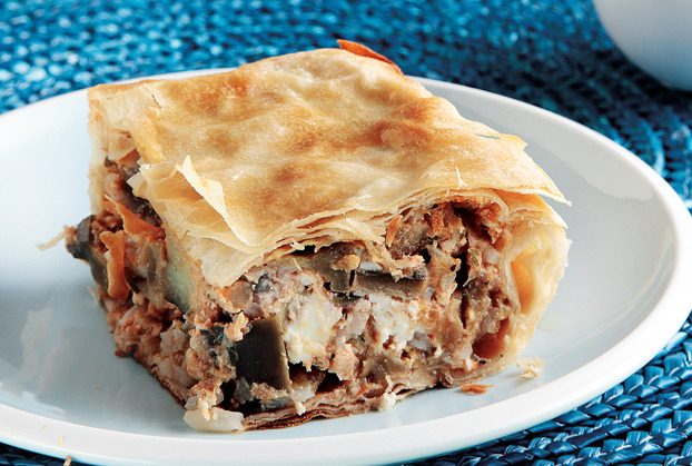 Ένα κιλό μελιτζάνες, μισό κιλό κιμά μαγειρεμένο όπως για τα μακαρόνια. Δεκαπέντε φύλλα μπακλαβά
