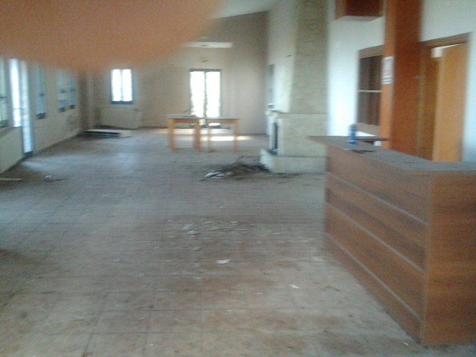 Σπασμένες όλες οι πόρτες αλουμινίου, ορθάνοικτα, και δεν υπάρχει τίποτα λειτουργικό, τα έχουν κλέψει όλα! Έκλεψαν κι όλο τον εξοπλισμό, κινητό και σταθερό. Δεν άφησαν ούτε τους διακόπτες από τις πρίζες! Μόνο η δεξαμενή πετρελαίου που δεν χωρούσε να βγει από τη πόρτα έμεινε στη θέση της για να θυμίζει ότι κάποτε υπήρχε καυστήρας πετρελαίου.