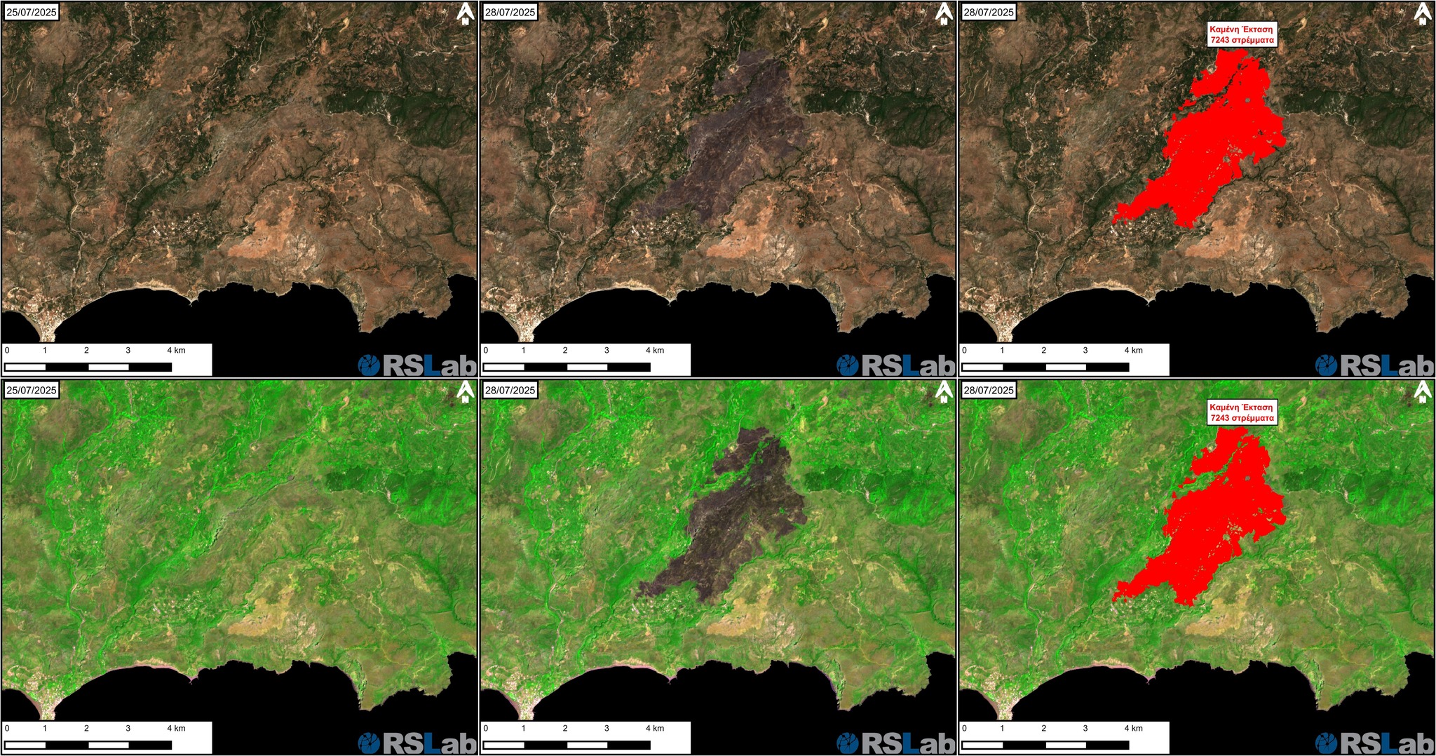 Ο συνοδευτικός χάρτης που εξέδωσε το ΙΤΕ παρουσιάζει με κόκκινο χρώμα την περιοχή που επλήγη από τη φωτιά. Παράλληλα, δημοσιεύονται συγκριτικές δορυφορικές εικόνες της περιοχής, τόσο πριν όσο και μετά την πυρκαγιά, στην ορατή όσο και στην υπέρυθρη φασματική περιοχή. Σε αυτές απεικονίζεται η πυκνή βλάστηση με έντονο πράσινο χρώμα, υποδεικνύοντας τα σημεία όπου η φωτιά δεν έχει καταστρέψει πλήρως τη φυσική κάλυψη.