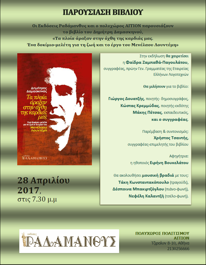 Οι εκδόσεις Ραδάμανθυς και ο πολυχώρος ΑΙΤΙΟΝ (Τζιραίων 8-10 Αθήνα) την Παρασκευή, 28 Απριλίου 2017, στις 7.30μ.μ. διοργανώνουν την παρουσίαση του βιβλίου του φιλόλογου-ιστορικού και συγγραφέα από τα Χανιά Δημήτρη Δαμασκηνού: