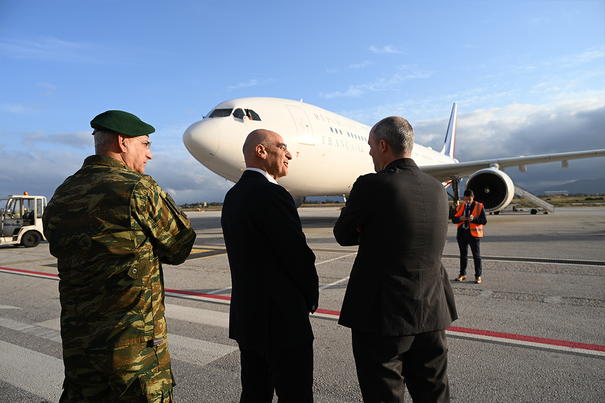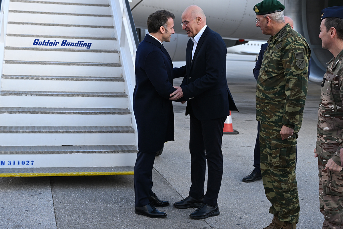 Κατά την άφιξή του στην Κρήτη, τον Γάλλο Πρόεδρο υποδέχθηκε ο Υπουργός Εθνικής Άμυνας, Νίκος Δένδιας. Οι δύο άνδρες επιβιβάστηκαν σε ελικόπτερο NH90 (H90) με προορισμό το γαλλικό αεροπλανοφόρο «Σαρλ ντε Γκωλ» (Charles de Gaulle), το οποίο βρίσκεται ήδη σε επιχειρησιακή ετοιμότητα στη θαλάσσια περιοχή ανοικτά των Χανίων. Η επιθεώρηση του αεροπλανοφόρου και της συνοδού ομάδας μάχης του αποτέλεσε τον κεντρικό πυλώνα της επίσκεψης, επιτρέποντας στον κ. Μακρόν να ενημερωθεί απευθείας για την κατάσταση στο πεδίο.
