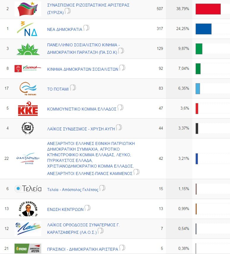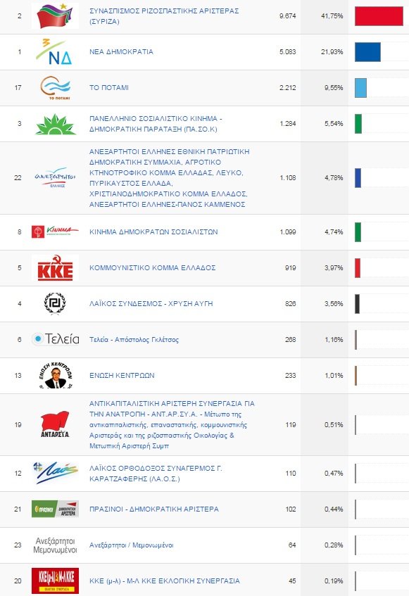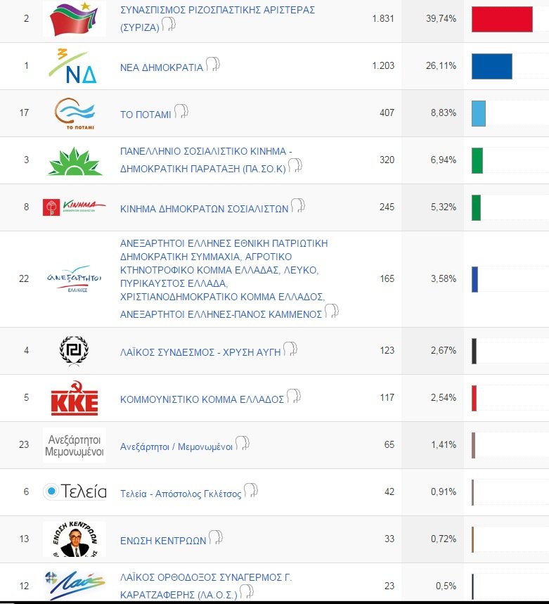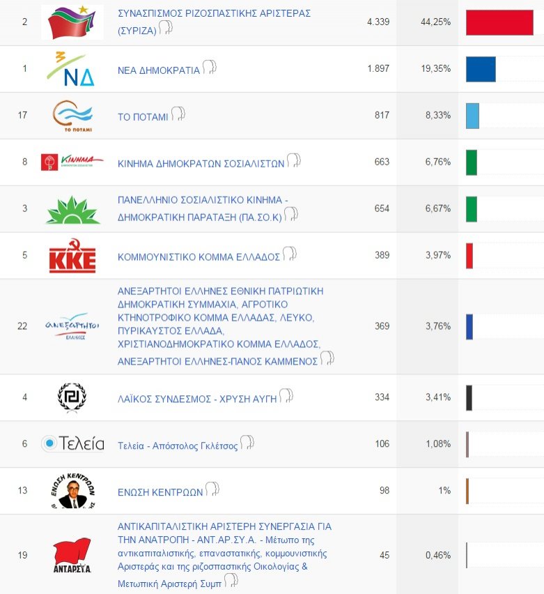 Το Ποτάμι είναι τρίτη δύναμη με ποσοστό 9,55%, ακολουθεί το ΠΑΣΟΚ με 5,54%, οι ΑΝΕΛ με 4,78%, Το Κίνημα 4,74%, το ΚΚΕ 3,97%, Χρυσή Αυγή 3,56%, Τελεία 1,08%, Ένωση Κεντρώων 1%, ΑΝΤΑΡΣΥΑ 0,52%, ΛΑΟΣ 0,47%, Πράσινοι-ΔΗΜΑΡ 0,44%.
