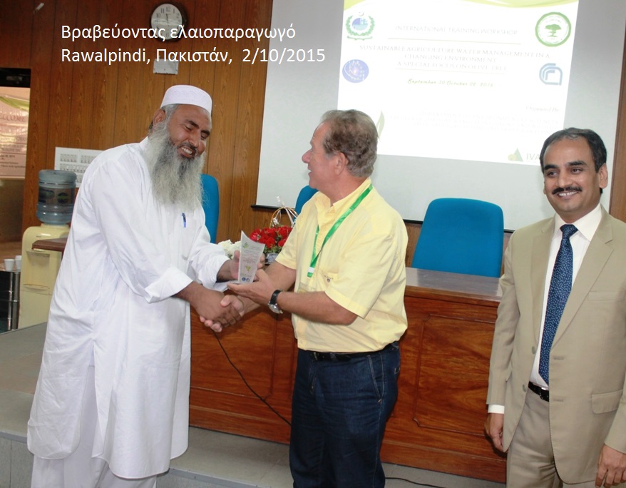 Τo Islamabad του Πακιστάν επισκέφθηκε από 28/9-4/10/2015 ο γεωπόνος Κων. Στ. Χαρτζουλάκης και συμμετείχε στη ομάδα αξιολόγησης του προγράμματος για την βελτίωση της διαχείρισης του νερού άρδευσης στο Πακιστάν που άρχισε το 2013 και χρηματοδοτείται από την κυβέρνηση του Πακιστάν και το Υπουργείο Εξωτερικών της Ιταλίας. Παράλληλα συμμετείχε ως εμπειρογνώμονας σε workshop για την καλλιέργεια της ελιάς στο Πακιστάν που οργάνωσε το Γεωπονικό πανεπιστήμιο του Rawalpindi, το Εθνικό Συμβούλιο Αγροτικής Έρευνας του Πακιστάν (PARC) και το Εθνικό Συμβούλιο Έρευνας (CNR) της Ιταλίας και παρουσιάσθηκαν τα μέχρι σήμερα αποτελέσματα των προσπαθειών που έγιναν αποσπασματικά τα τελευταία χρόνια.