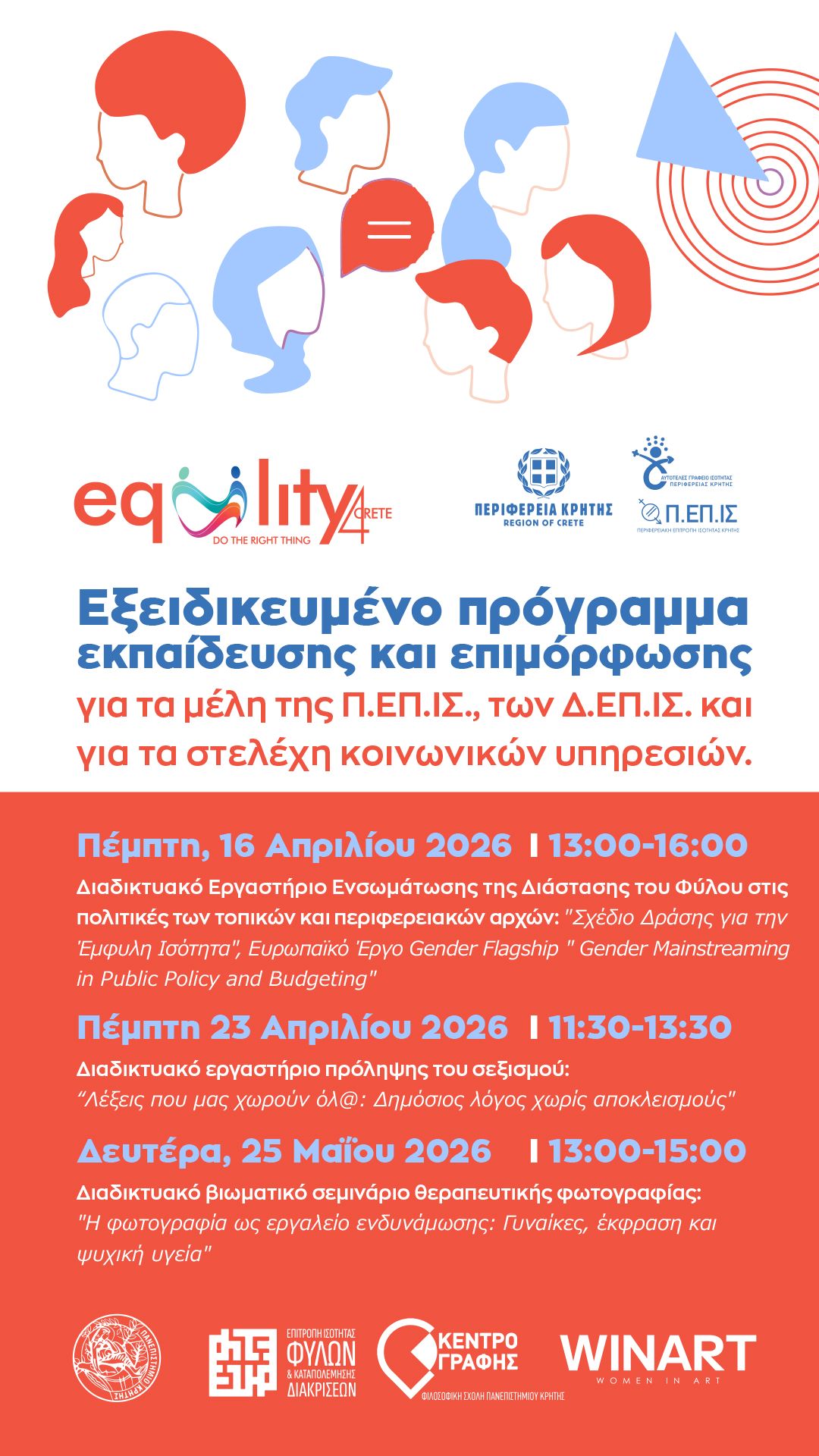 Με ιδιαίτερη επιτυχία συνεχίζεται το εξειδικευμένο πρόγραμμα εκπαίδευσης και επιμόρφωσης που υλοποιεί η Περιφέρεια Κρήτης για τα μέλη της Περιφερειακής Επιτροπής Ισότητας (Π.ΕΠ.ΙΣ.), των Δημοτικών Επιτροπών Ισότητας (Δ.ΕΠ.ΙΣ.) Κρήτης, καθώς και για τα στελέχη κοινωνικών υπηρεσιών και φορέων της Κοινωνίας των Πολιτών.